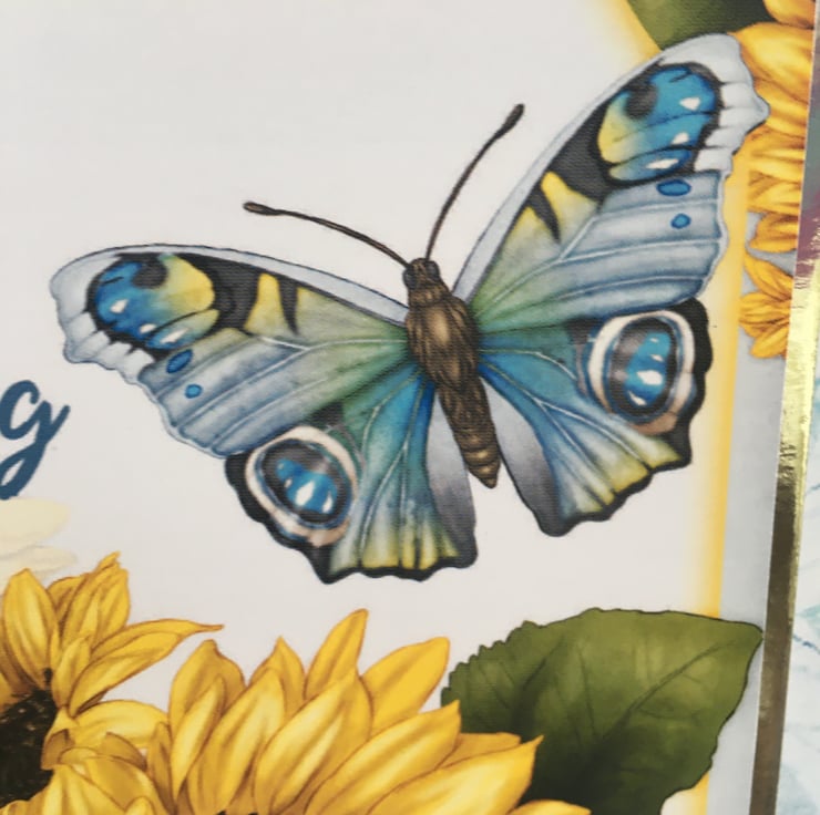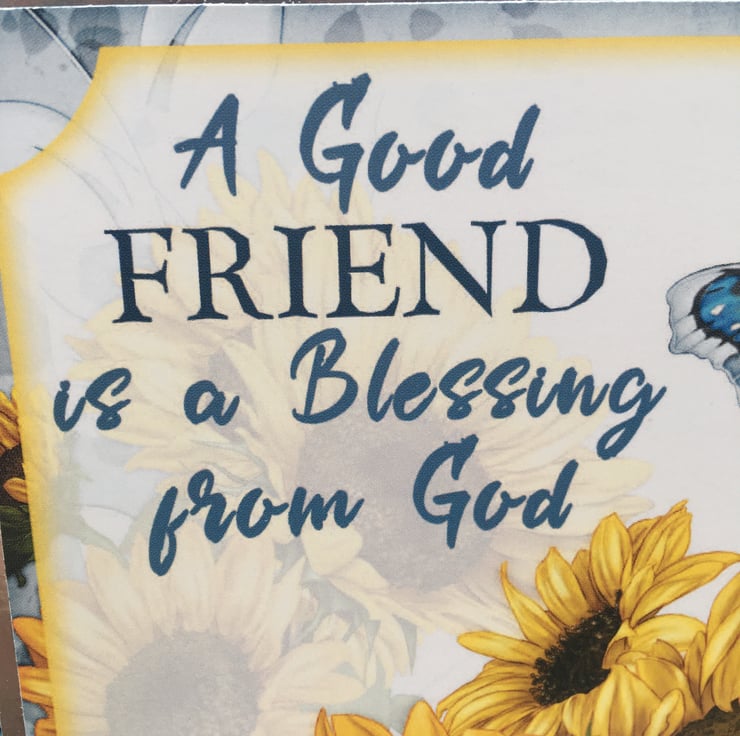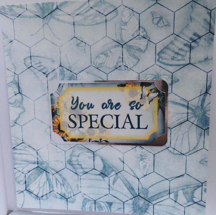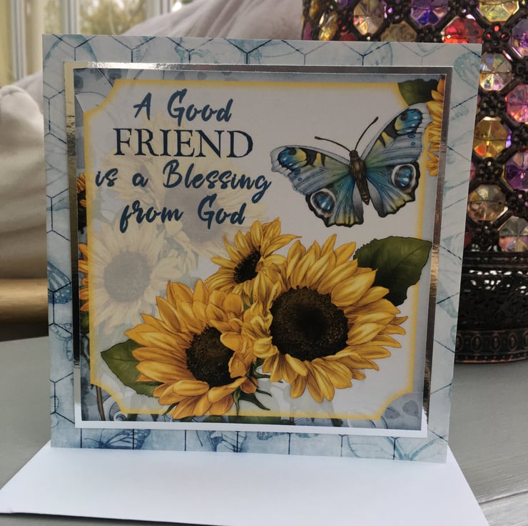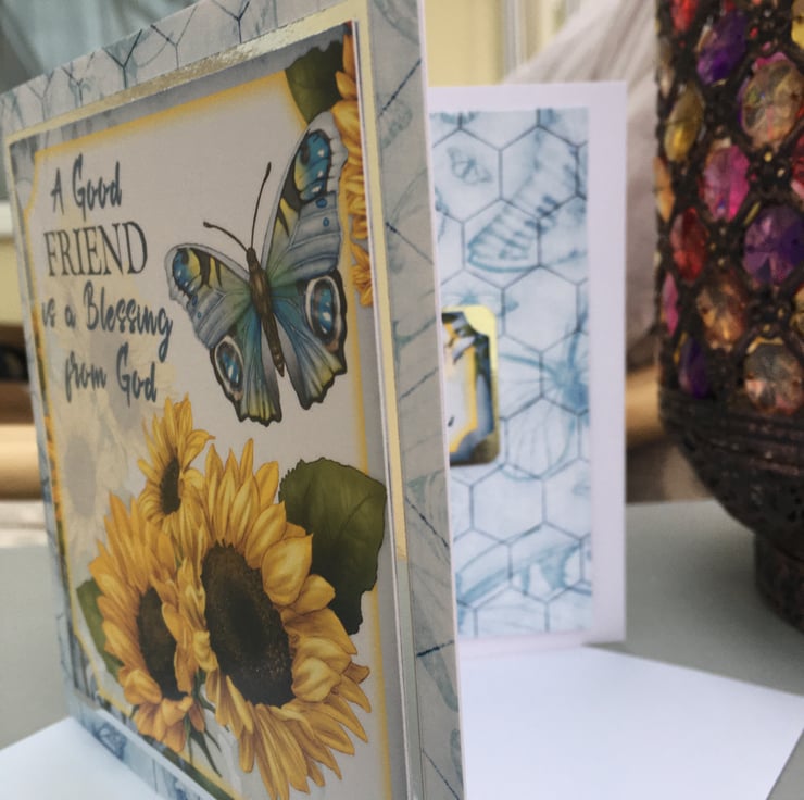 Sometimes we just want to send a card to say you appreciate someone. This lovely card is something special to send to a friend. It is approximately 15x15cm square and is covered in a lovely blue butterfly paper. The main design has a spray of sunflowers and a blue butterfly. The greeting says A good friend is a blessing from god. Inside the card has matching paper with a greeting that says You are so special.