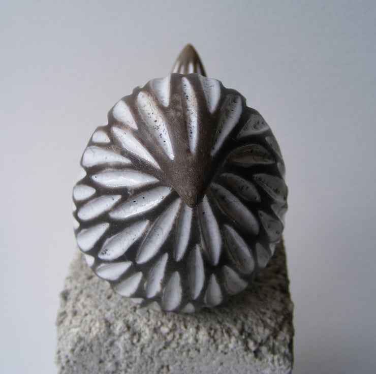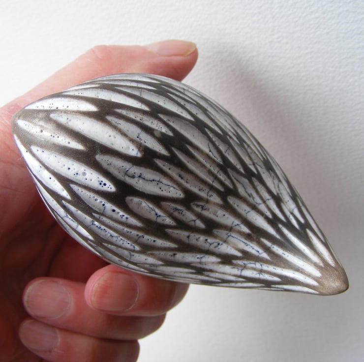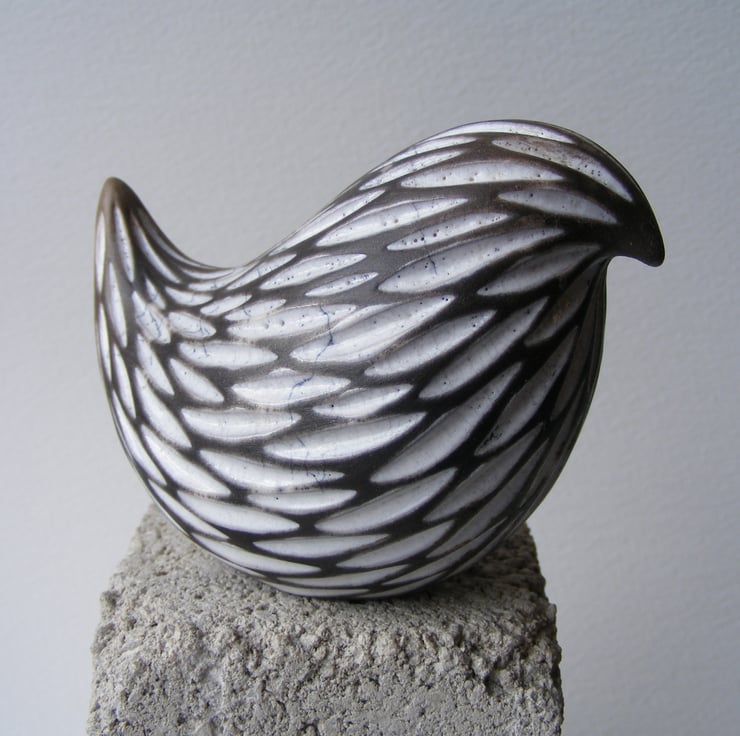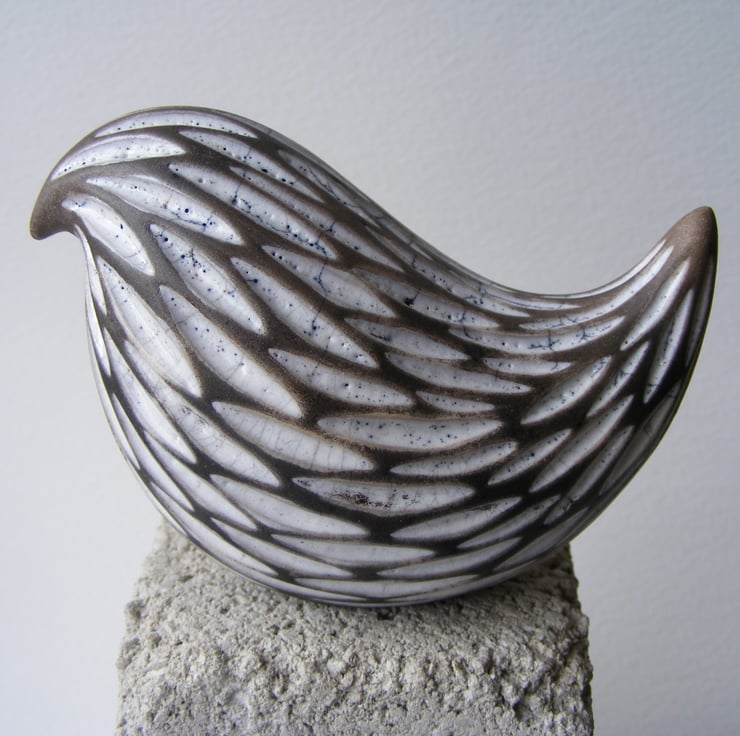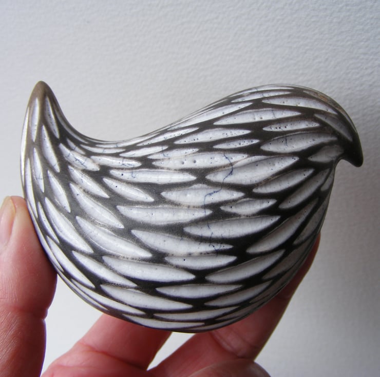 This little bird measures approx 6cm high, 9cm long and 4.5cm wide. To make it I first modelled the shape then made a mould from it. I then cast it with white earthenware clay, when it is leather hard I carved out the feather marks, dry it and then fire it to 1040 degrees in an electric kiln. I then fill the indents with white raku glaze and fire it again in a gas kiln, then I smoke it in sawdust in a lidded container, the unglazed parts are turned a black/grey colour, it is then polished with bees wax.