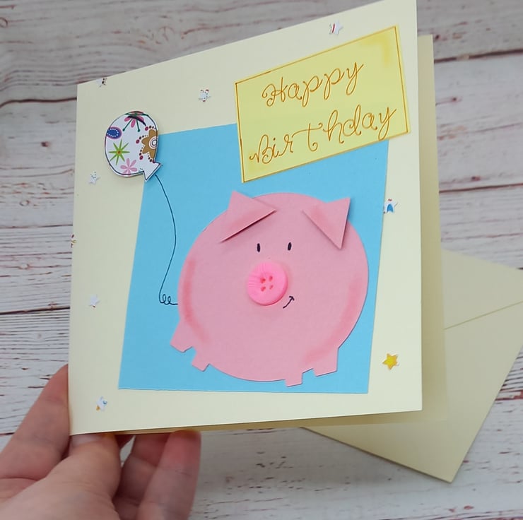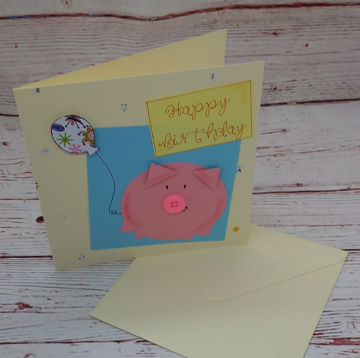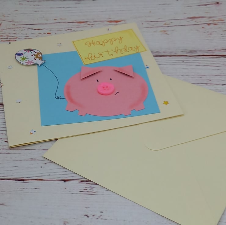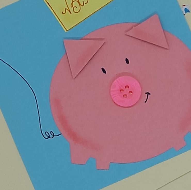 A porky pink pig sporting a cute smile, button nose and a bright patterned balloon tied to his curly tail this is a simple card that is certain to please the Birthday boy or girl.