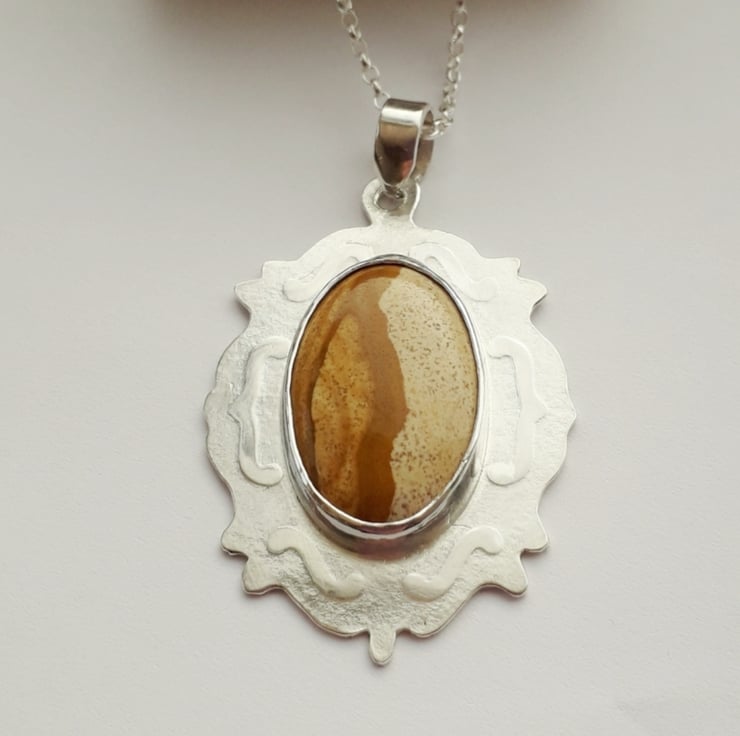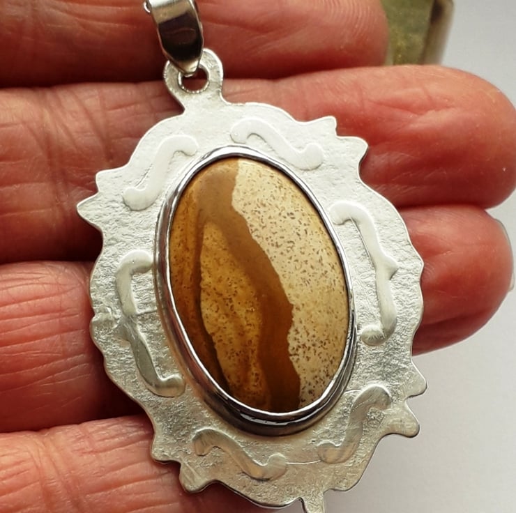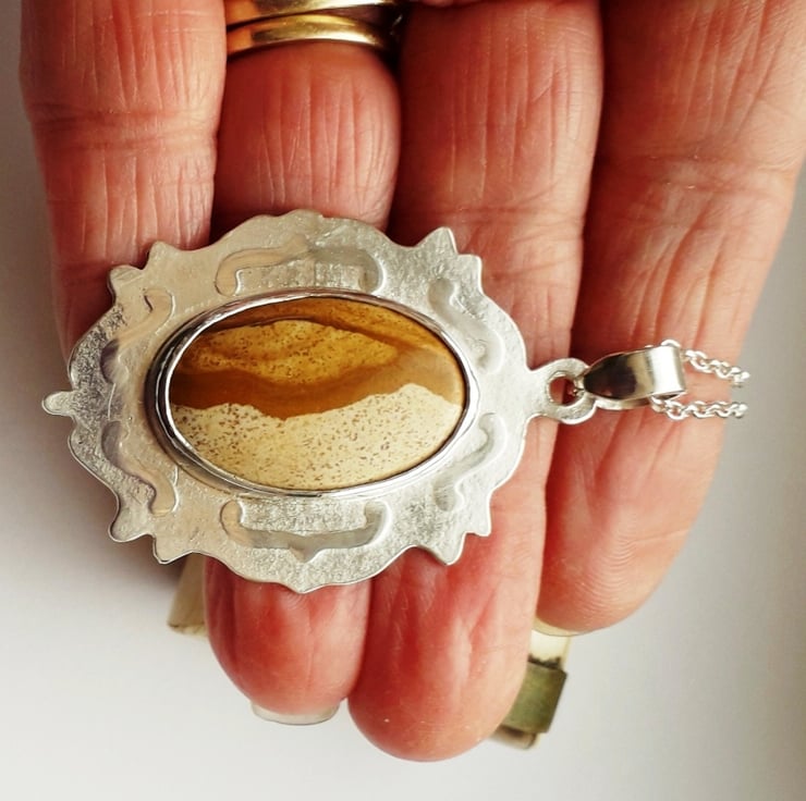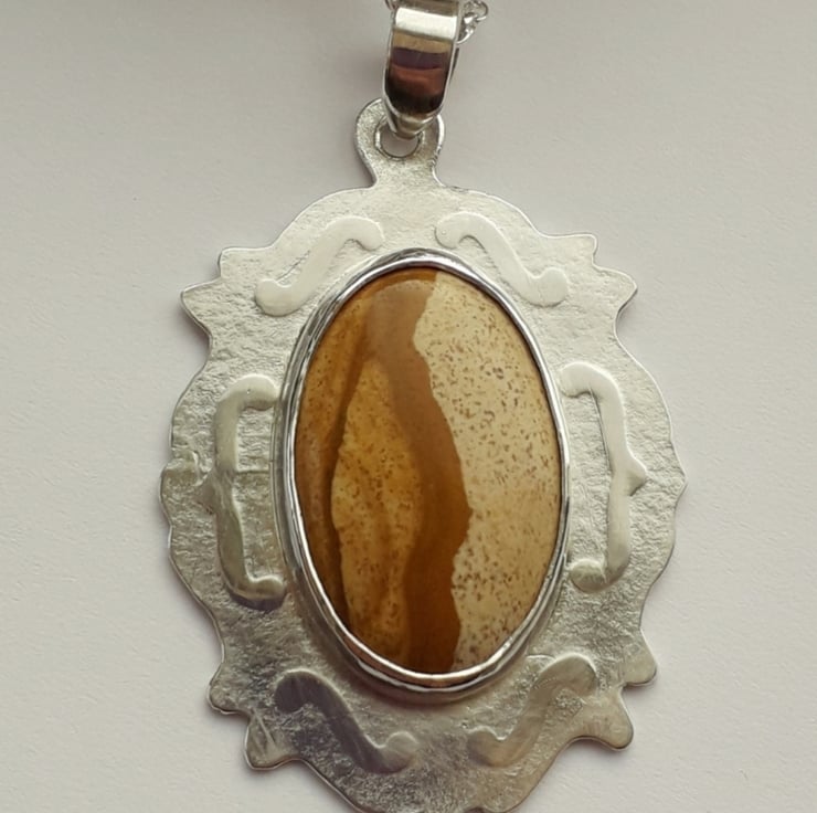 The Silver pendant that the Jasper is set into has decorative hand cut edging and a decorative design on the front of the pendant, the decoration was added via the embossing technique before soldering on the bezel.
