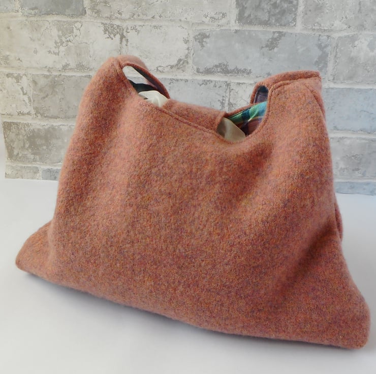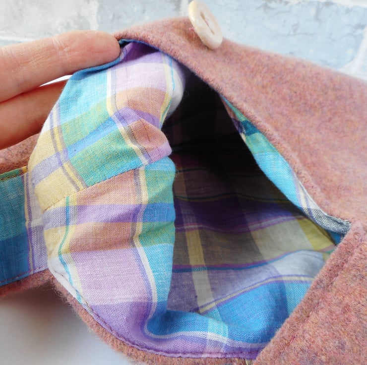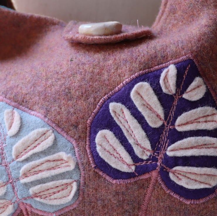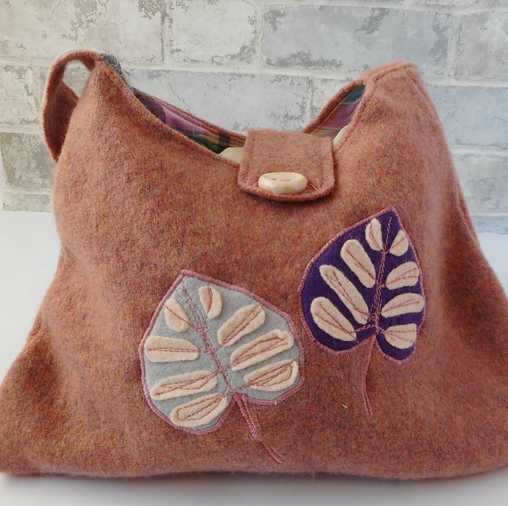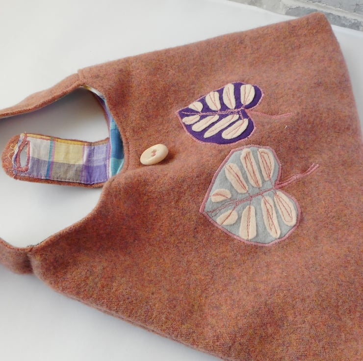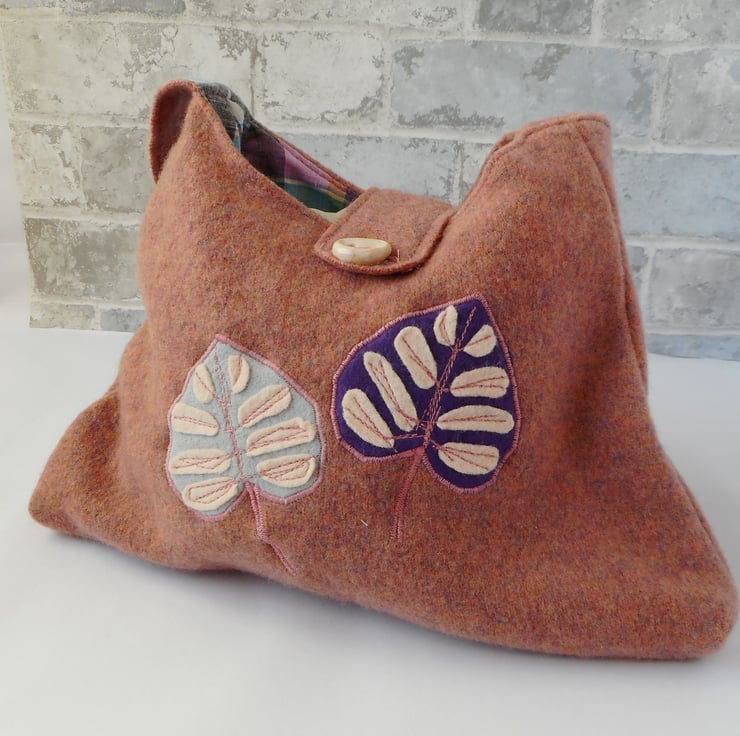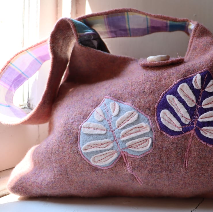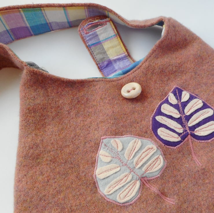 Made from recycled materials. This is a soft, floppy bag. I used a lightly felted cashmere sweater in a beautiful marled dusky pink. I then used wool felt to create two leaf shapes, inspired by palms, and appliqued them to the front before adding details with machine embroidery. The bag is pyramid shape and fastens with a ceramic button and buttonhole. Fully lined in check fabric from a recycled cotton shirt.