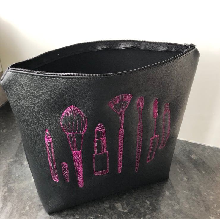 This bag is made from faux black leather, and has an embroidered design on one side and a zip opening.