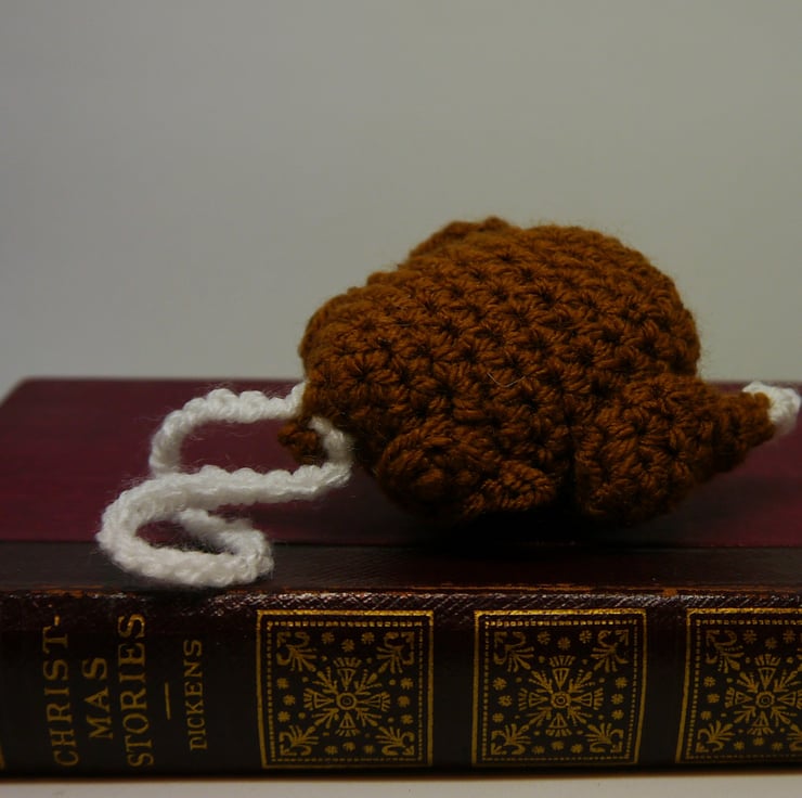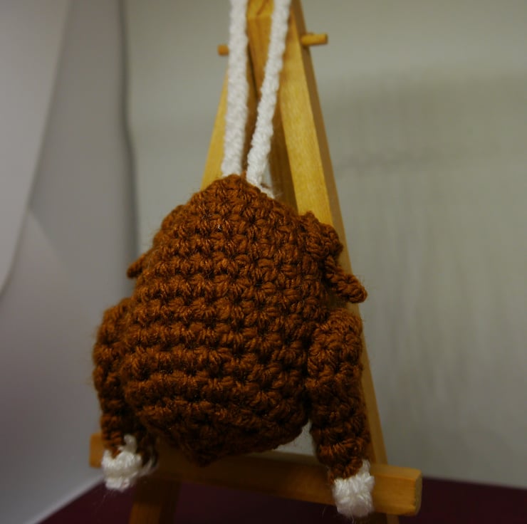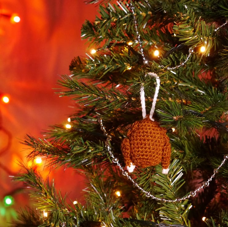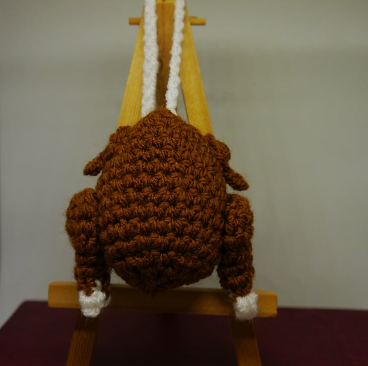 Looking for something different to decorate your Christmas tree how about this quirky crochet turkey. In golden roasted colour with wings. Legs and a convenient hanging loop, he is lightly stuff to give shape and measures approximately 6cm wide by 8 long excluding loop. Created in a smoke and pet free home, designed as a decoration not a toy.