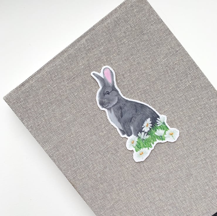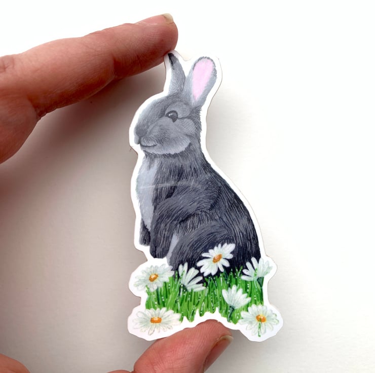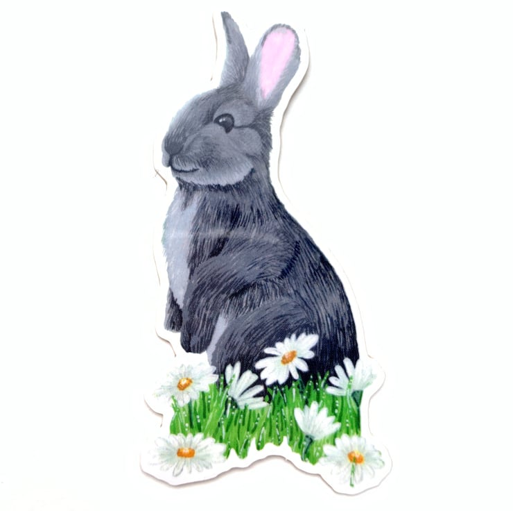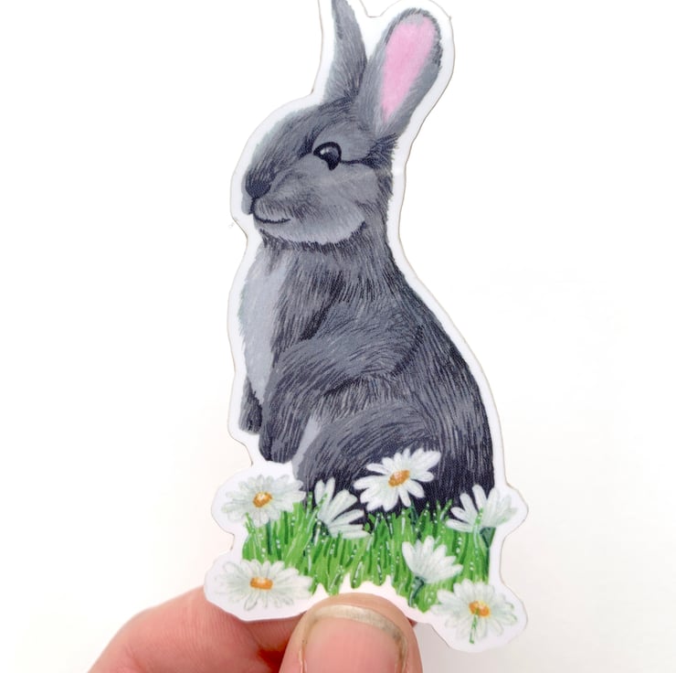 This rabbit and daisies die cut sticker is of a lovely wild grey rabbit with white daisies at its feet. It can be used on everything inside and outside, from your water bottle to your surf board. the sticker roughly measures 8cm x 4.2cm and is PVC free and environmentally friendly.