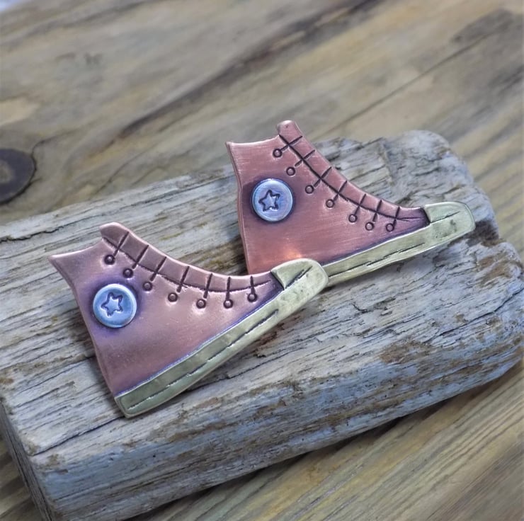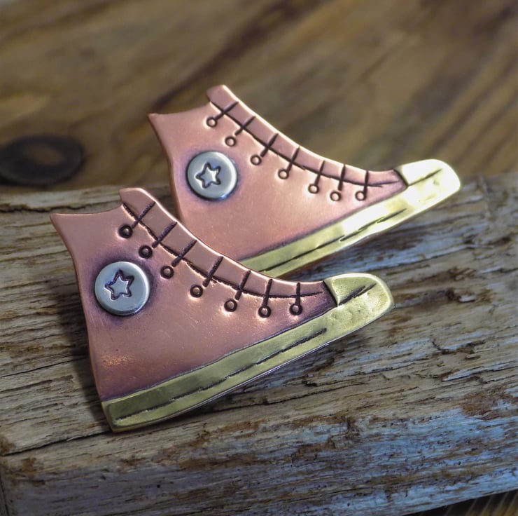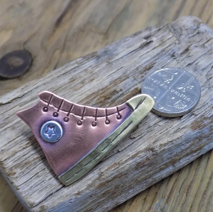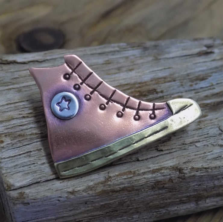 A fun brooch in the style of a baseball boot! made from 1.5 mm thick copper with a soldered on brass soul and toe cap with a sterling silver star logo on the ankle. A sturdy brooch setting has been fixed to the back with strong jewellers glue. Would make a great quirky gift, or a treat for yourself!