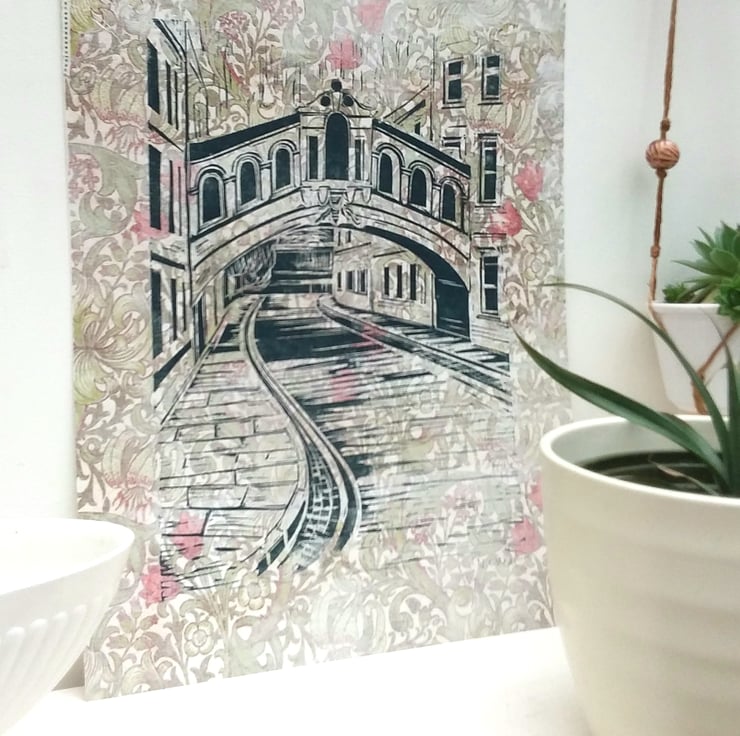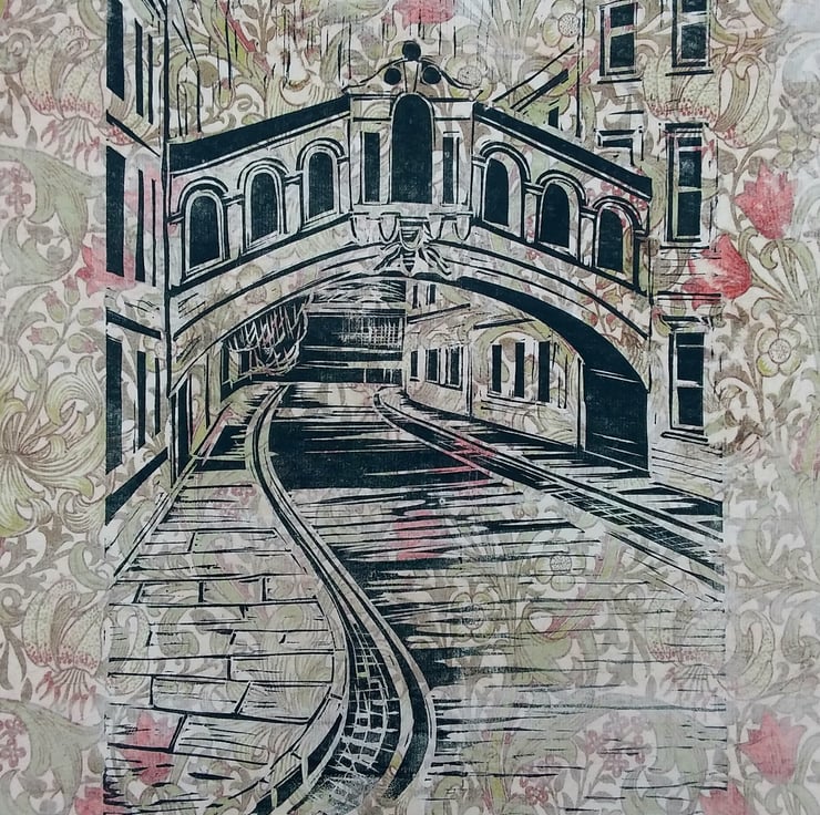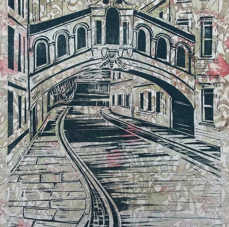 I live in one of the most beautiful cities in the world and have been making images inspired by the buildings and views that I cycle through daily. I use and combine various printing techniques and also print onto a variety of papers. In this piece I have printed on a light piece of white paper which has then been collaged over a William Morris traditional pattern. The decorative design shows through around the ink of the print and is part hidden.