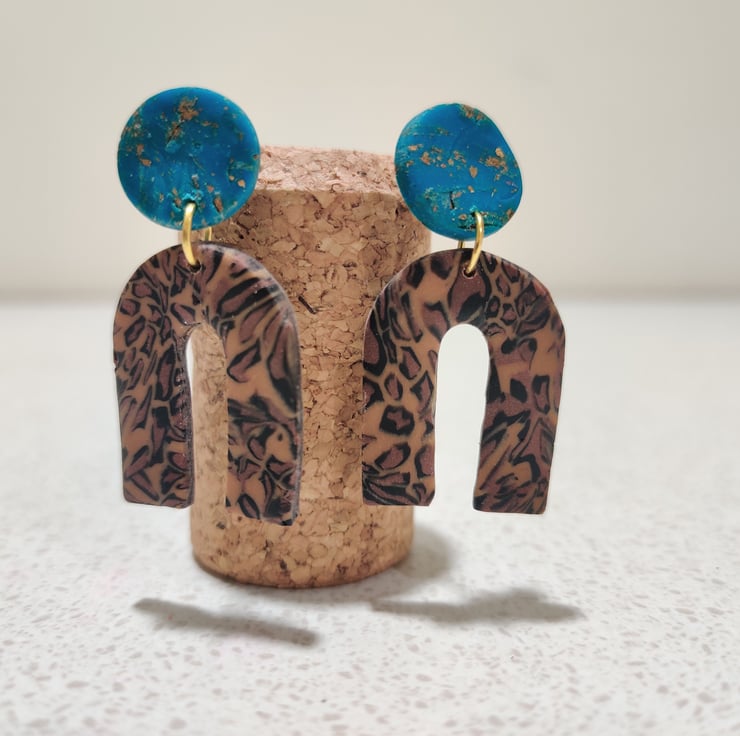 Hand made polymer clay earrings with with a leopard print patten and teal stud. Small size. Stud fixing which can be painted with hypoallergenic coating for free on request. Please see all photos for close up detail. All products handmade therefore there may be minor imperfections. Each pair sold as seen, message for more info