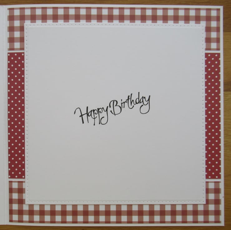 A pretty red and brown card featuring the image several mice making and decorating a birthday cake complete with candles. The image is surrounded by mats and layers in deep red and silver, including one which is cut using an intricate floral die, These sit upon a background of red/brown gingham card. The card has a deep red satin bow on the front and the inside is finished to coordinate with a simple Happy Birthday greeting.