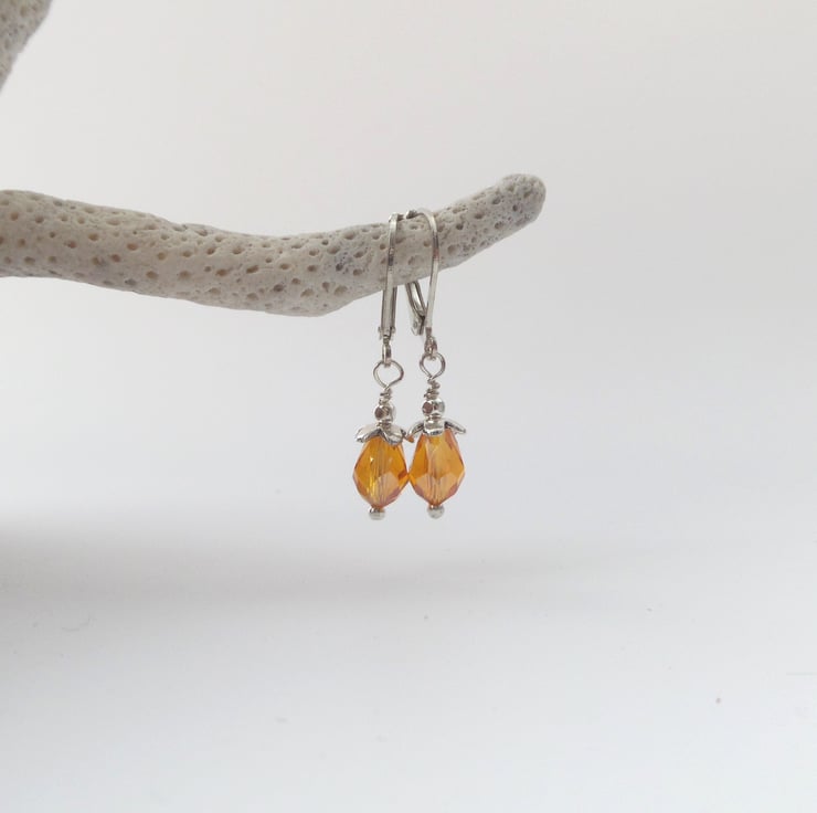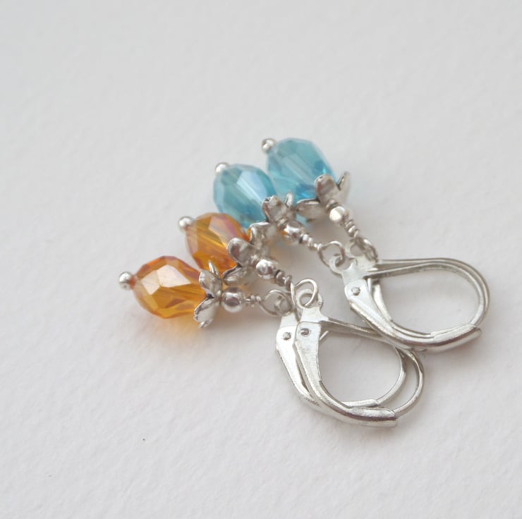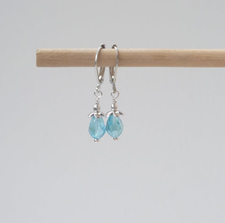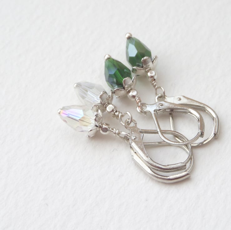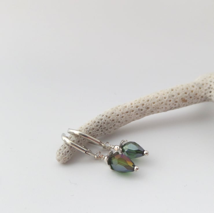 On silver plated French hinged fittings, these are short drop, tiny peardrop crystals with silver flwer bead caps. cute and dainty, these crystals have an Aurora Borealis finish.
