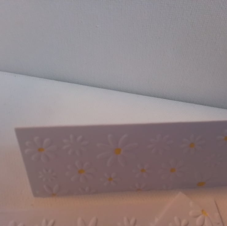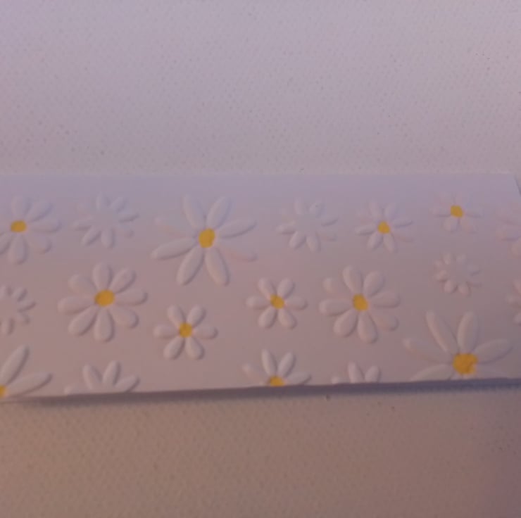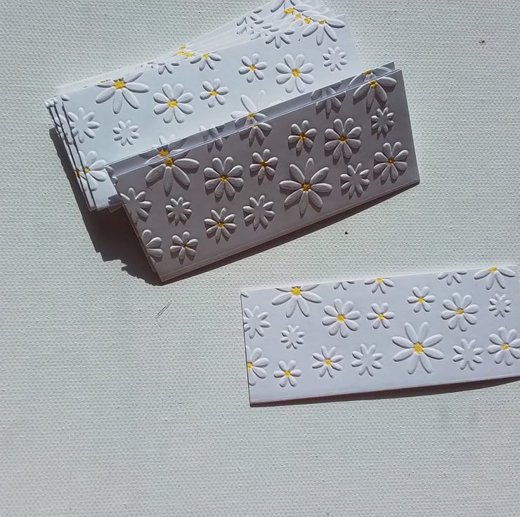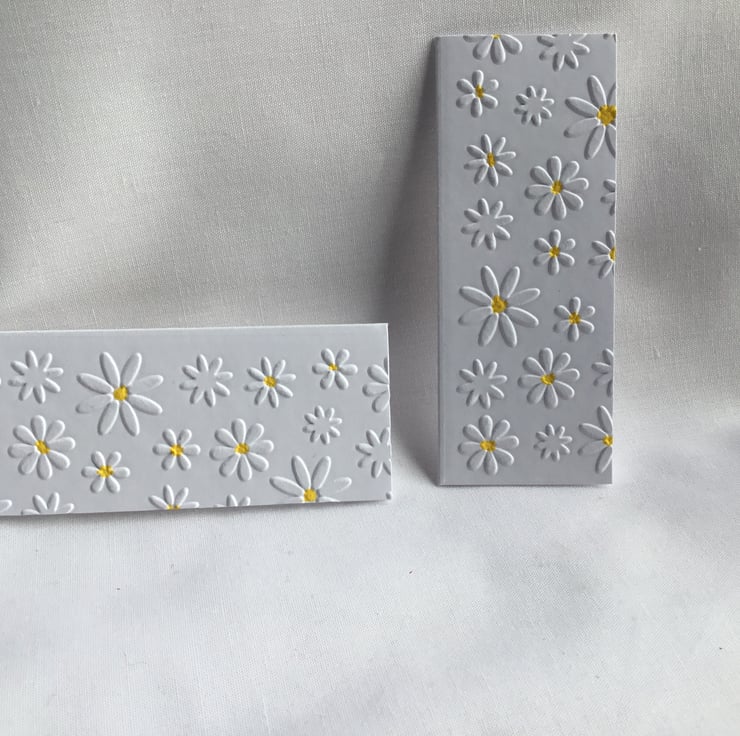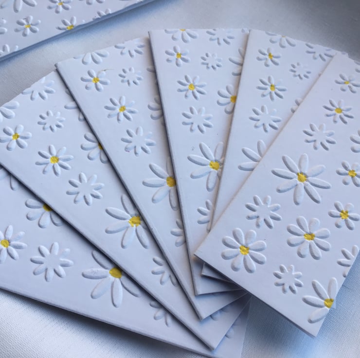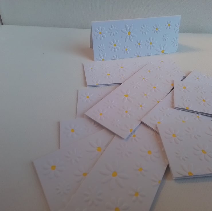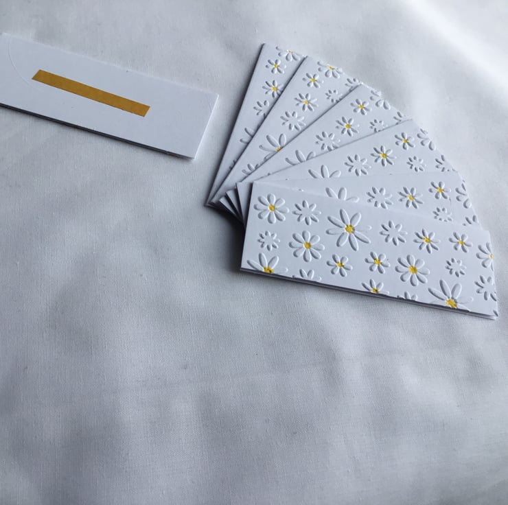 Pack of 10 embossed gift cards each embossed with daisies and a painted yellow centre.