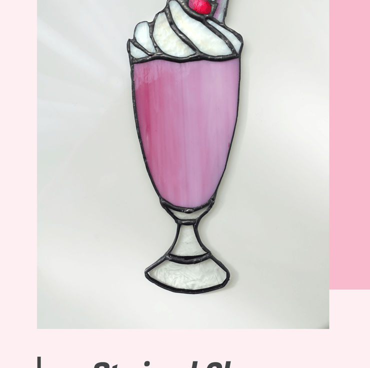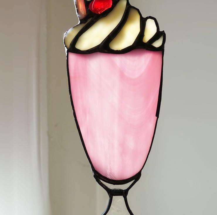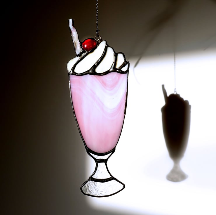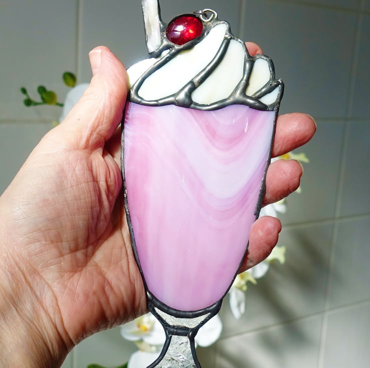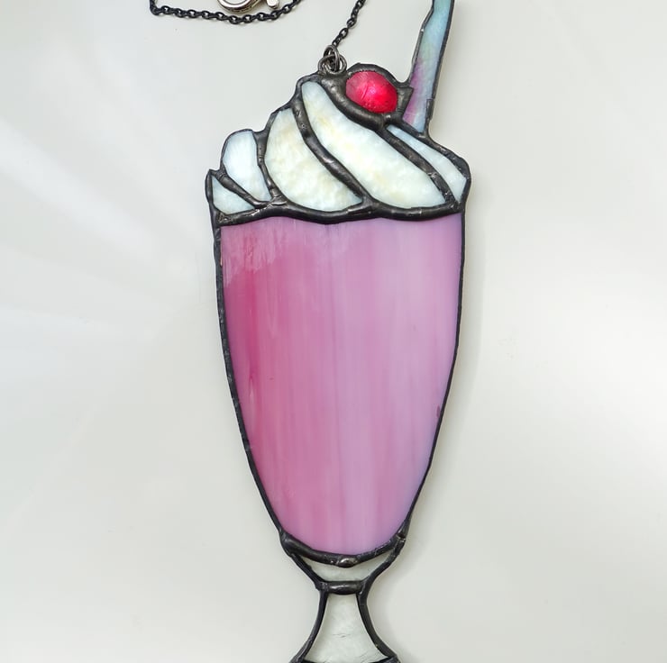 Reduced from £24. Stained glass crafted into the shape of a scrumptious strawberry milkshake topped with whipped cream and a juicy red jewel cherry. There's a textured straw, and it hangs from a slim metal chain.