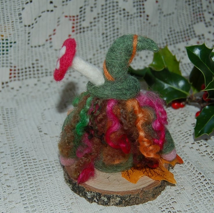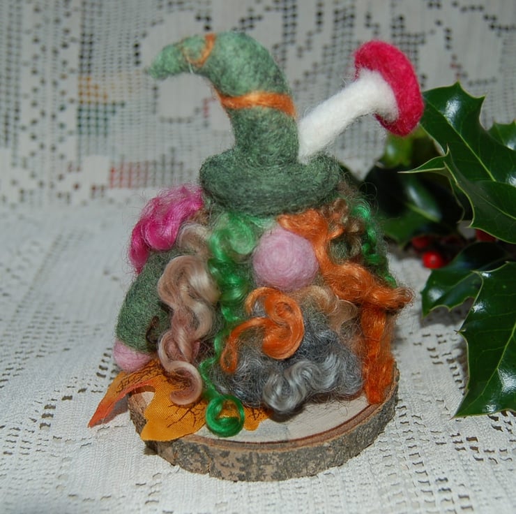 All wool, I have made him by needle felting wool fibre into a firm core and adding coloured fibre on top of the core to give a lovely finish. Autumn coloured wool curls form his hair and beard. He is so part of the forest that a toadstool is growing out of his hat.