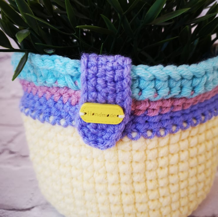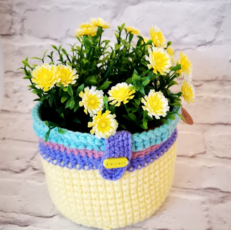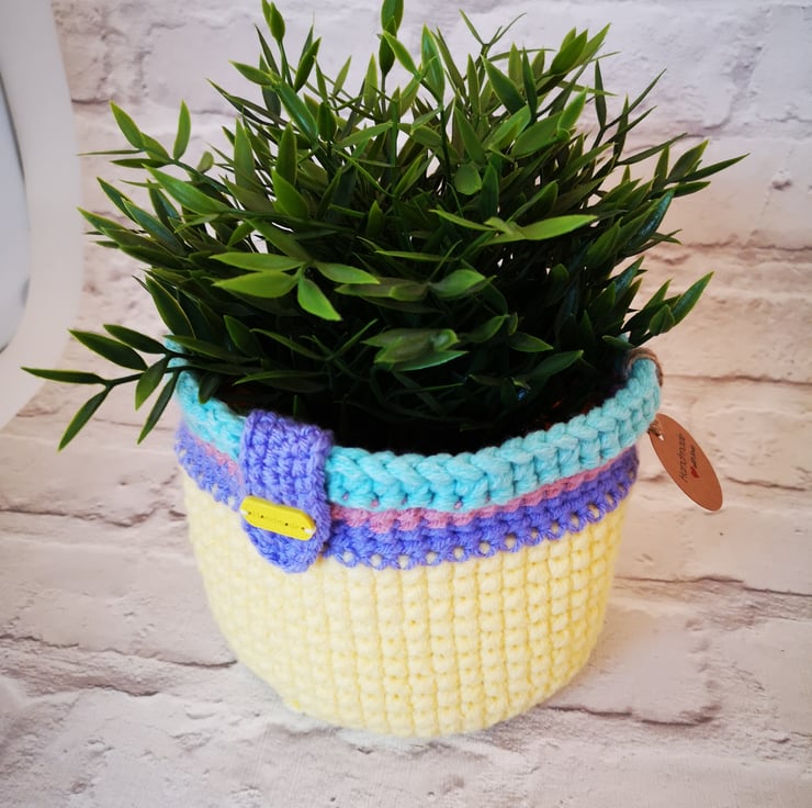 A plant pot holder/small basket crocheted in Spring pastel yarns - perfect for Mothers Day of Easter gifting