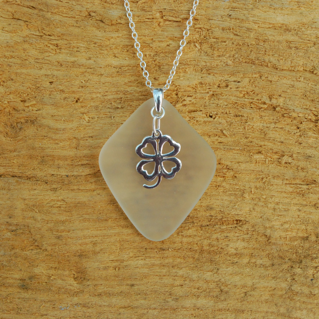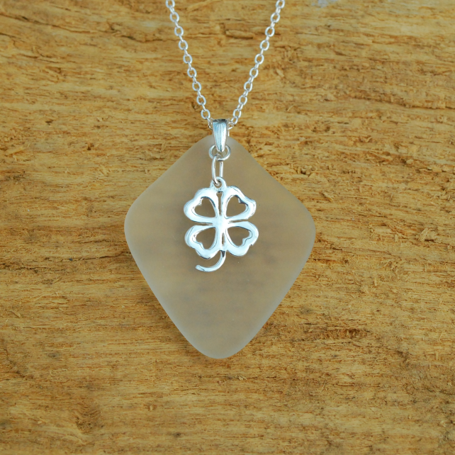 The piece of tumbled beach glass we've used for this pendant is an amazing shape - a beautiful diamond. The glass has come from an old bottle and curves wonderfully behind the sterling silver clover leaf. We love the way the shape of the charm and the shape of the glass go together to create a lovely pendant. All the metal in this pendant is sterling silver.
