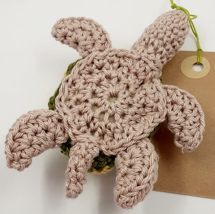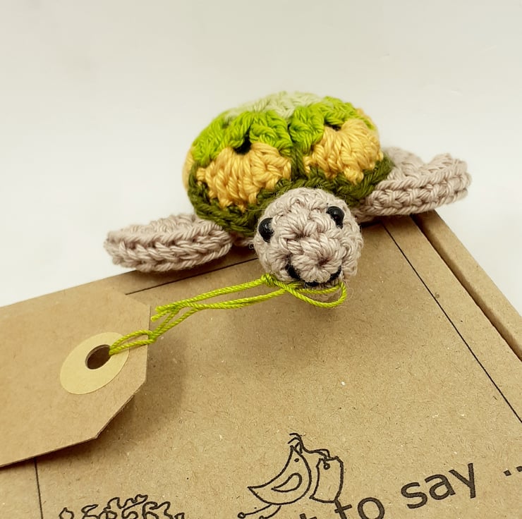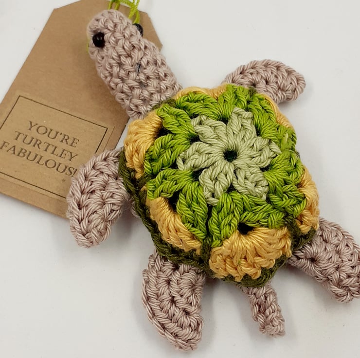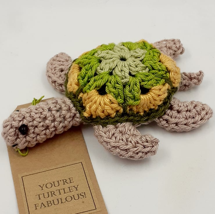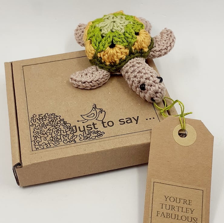 This happy chap is all set to deliver a message on your behalf. It is crocheted in cotton, lined with felt and filled with polyester stuffing. It has beady black eyes and carries a tag which reads You're Turtley Fabulous although I am very happy to exchange this tag for one with wording of your choice. The turtle measures approximately 12cm in length and comes wrapped in tissue in a labelled PIP (Postage in Proportion) box, all ready to be given or posted on.