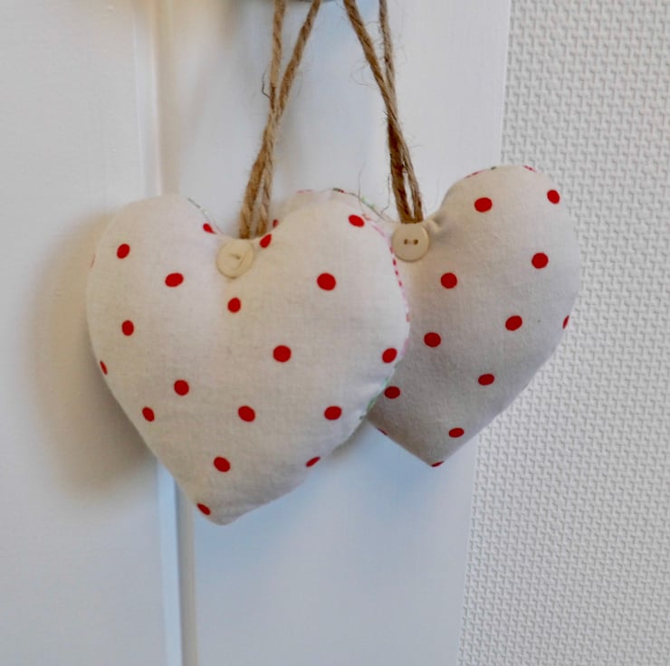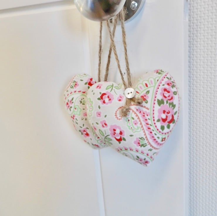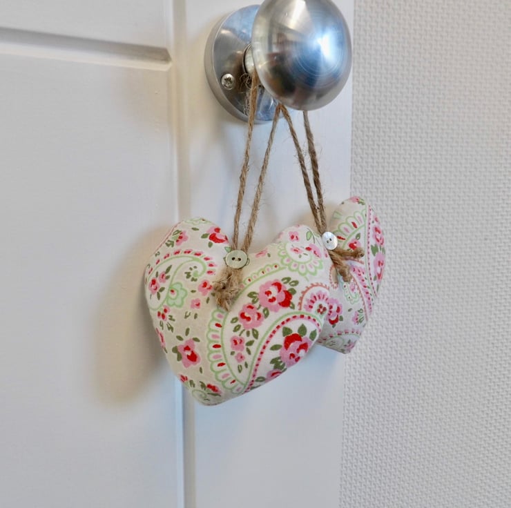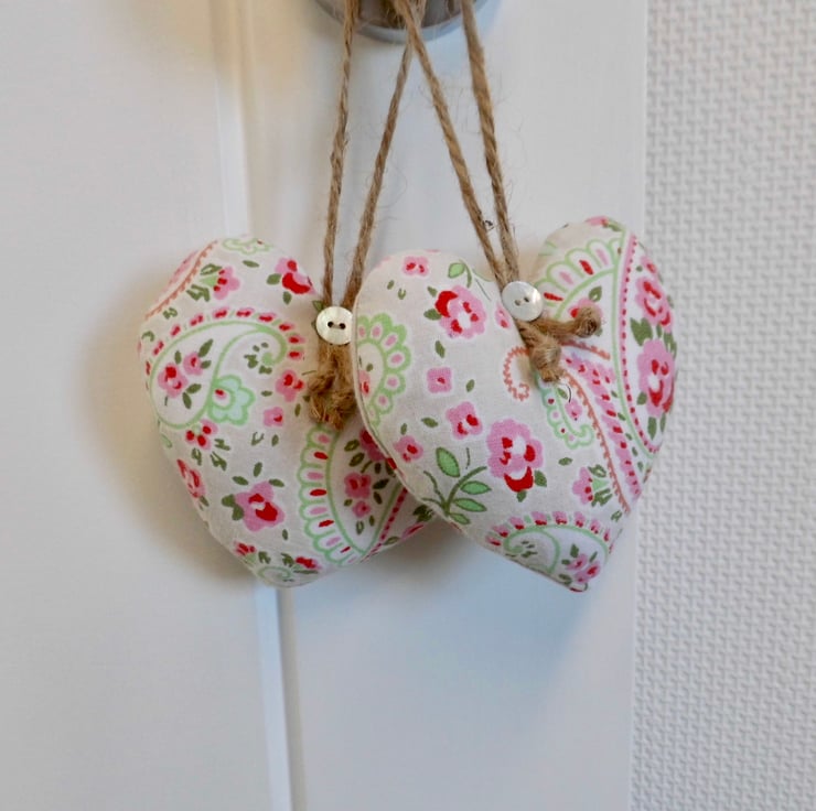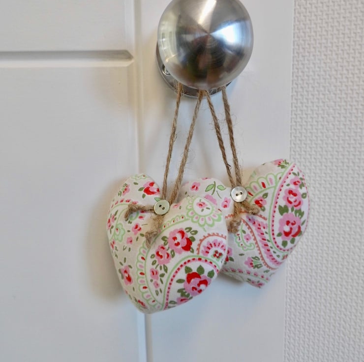 A smaller version of my popular heart decorations made in a shabby chic style! A pair of padded heart-shaped door hangers carefully made using a Cath Kidston cotton print in a paisley style on the front and spot fabric on the back. Hanging on a loop of natural jute twine with a mother-of-pearl button on the front and a little button on the back for neatness.