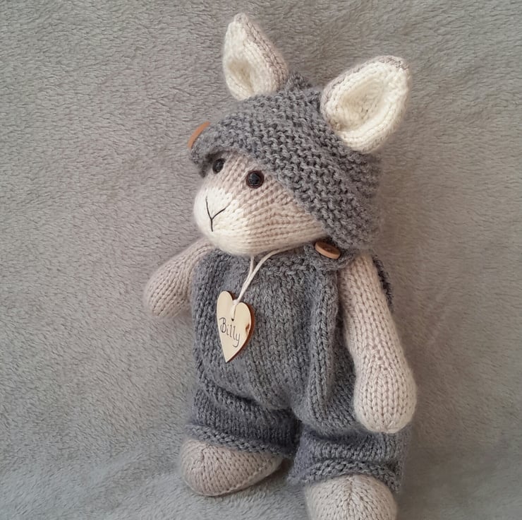 Billy was knitted in a beige wool and acrylic Aran yarn with cream contrast muzzle, inner ears, foot pads and little bobble tail.