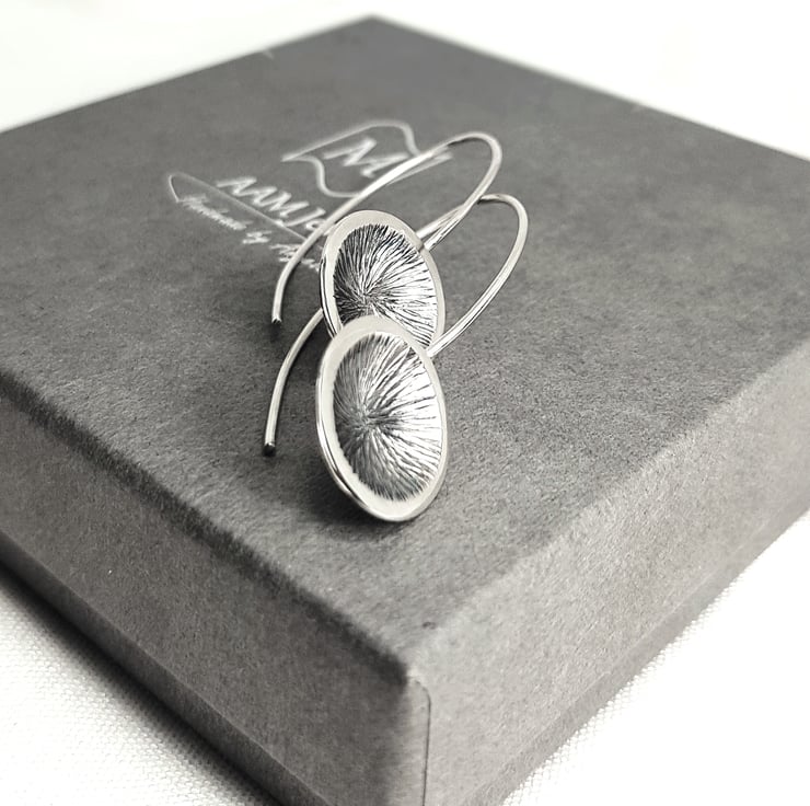The round disks have been domed and hand textured on the front and back with the front section being oxidised (darkened) to bring out the details of the design. The edges of the disks have been finished to a high polish.