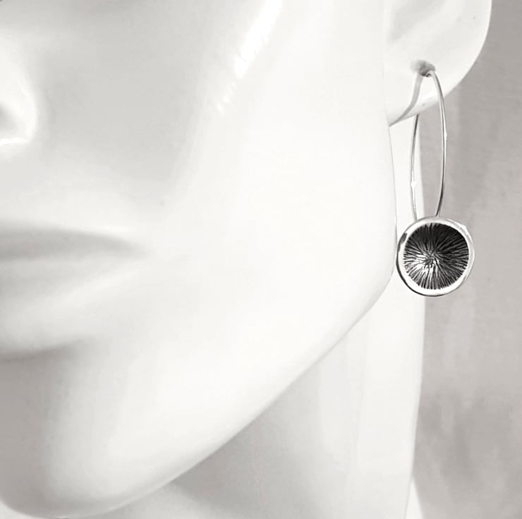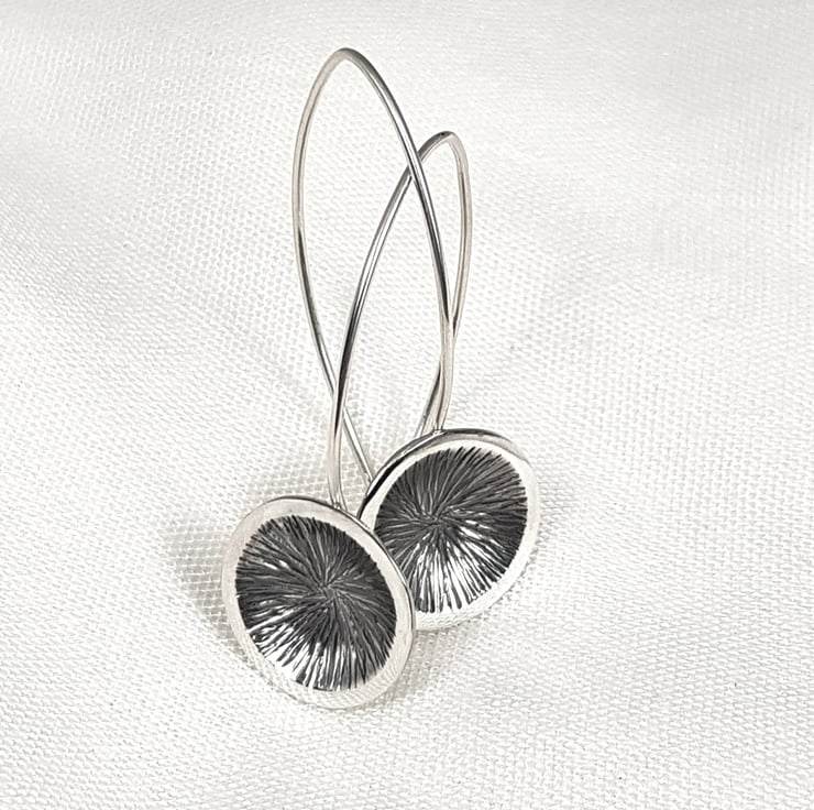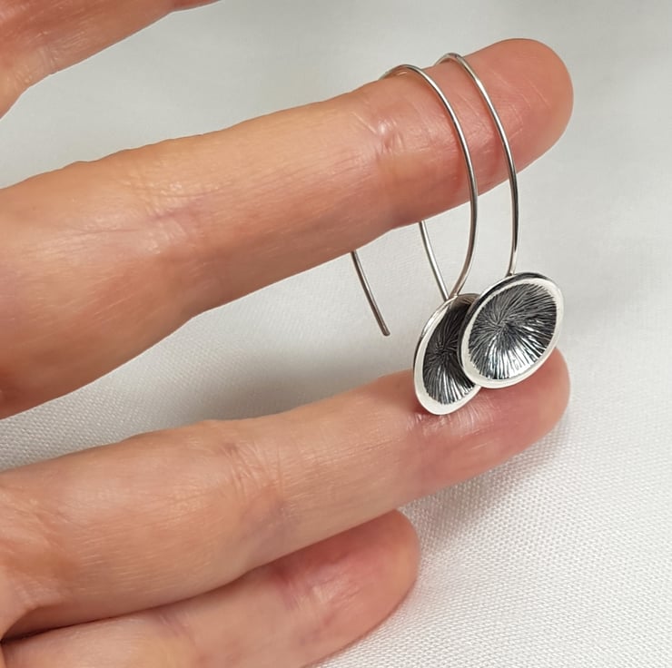 Sterling silver disk earrings with elongated curved ear wires.