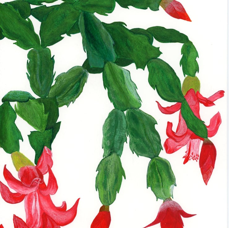I originally wanted to design my own Christmas cards, using alternative bird and plant subjects to the traditional ones of robins and mistletoe. The Zygocactus truncatus, or Christmas cactus as it is colloquially called, is a cactus that grows on trees (epiphytic) with its stems hanging in an umbrella-like shape. The flowers can be scarlet, white or bright carmine and typically emerge in autumn and winter – hence the ‘Christmas’ nickname. Originally from Brazil, the Zygocactus truncatus can be found in tropical and sub-tropical rainforests, or happily grows as a houseplant in the northern hemisphere.