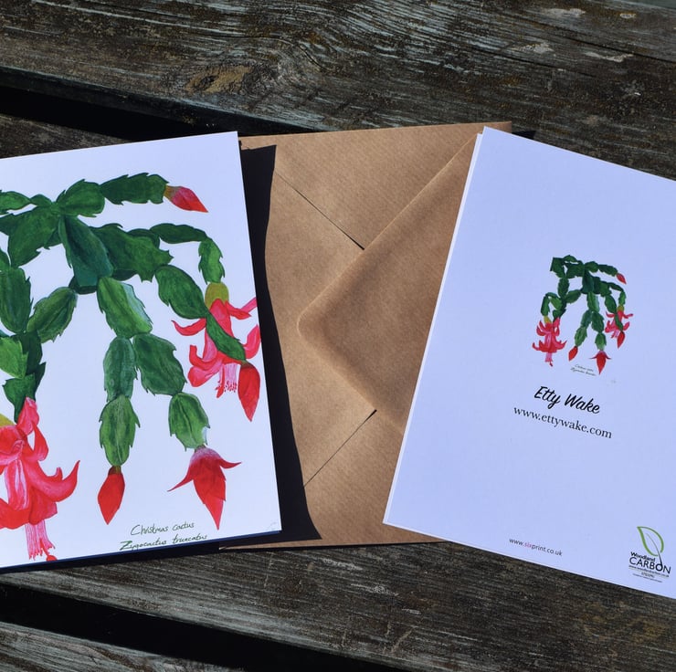 Greeting card featuring a Zygocactus truncatus plant commonly known as a Christmas cactus. The card is blank inside so can be used for all occasions.