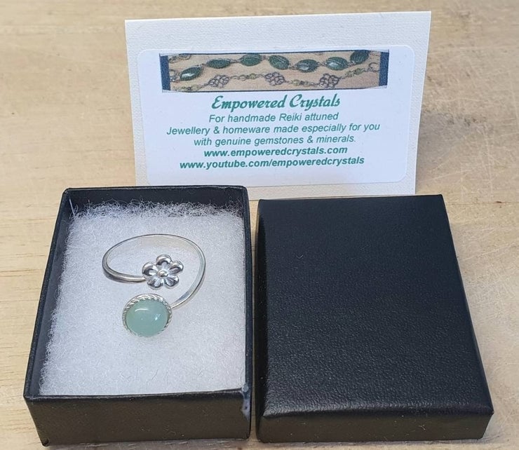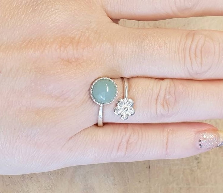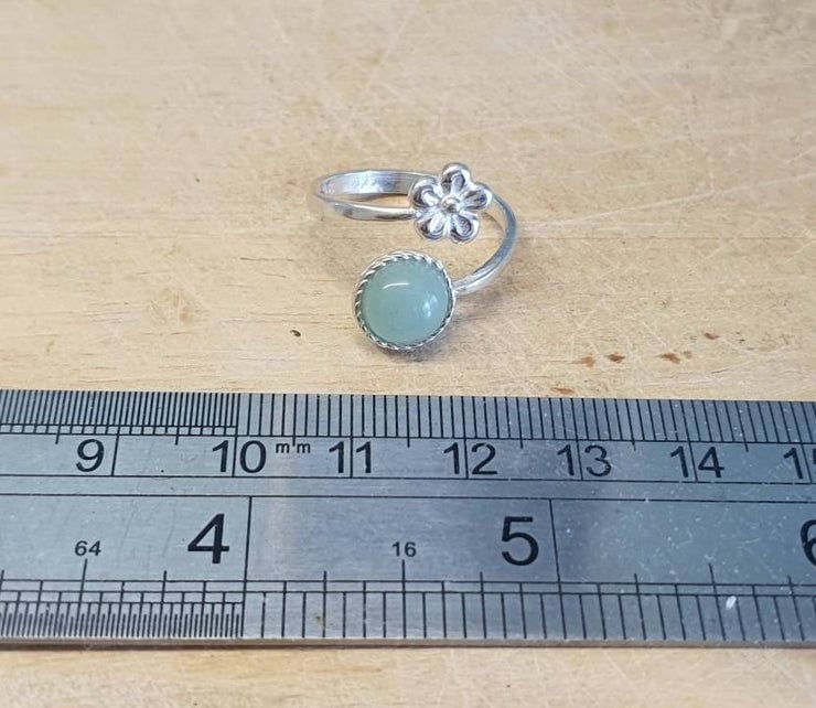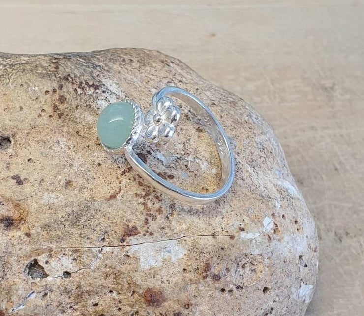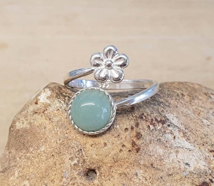 Green Aventurine Flower Ring. Adjustable 925 sterling silver rings for women