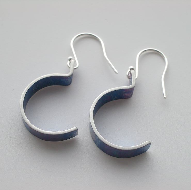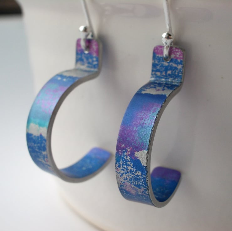 These hoop earrings are made from aluminium which I have hand dyed in a random pattern in purple and blue. The dye is sealed in to the metal through heat so that it becomes a permanent part of the surface of the aluminium. I have cut out the strips of aluminium and bent them on a mandrel in to a half hooped shape earring. The hoops are attached to a sterling silver fish hook style ear fitting. The hoops measure approximately 5mm across and from the top of the aluminium hoop to the bottom it measures 21mm.