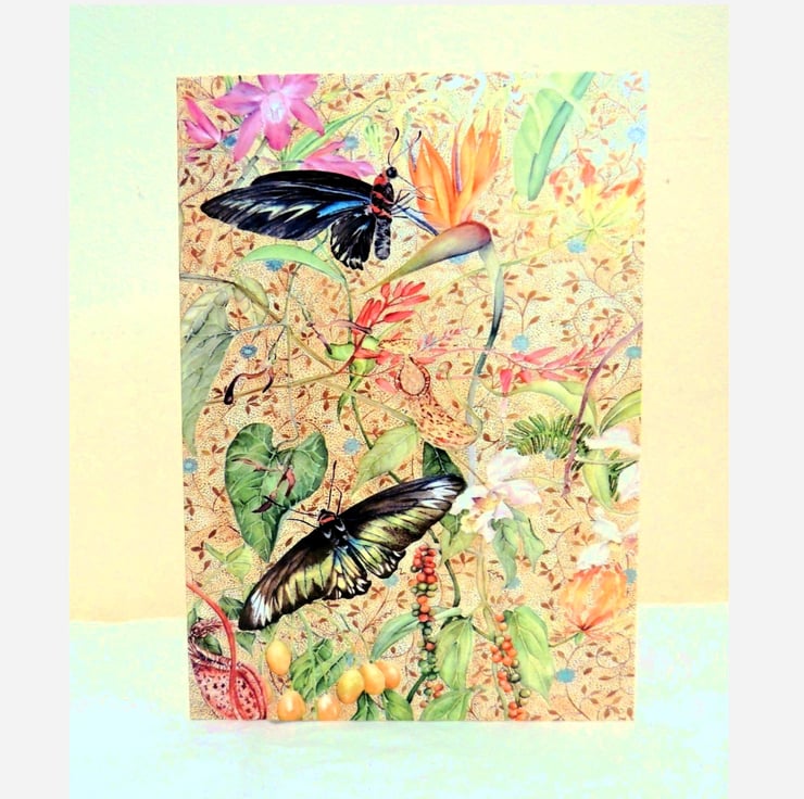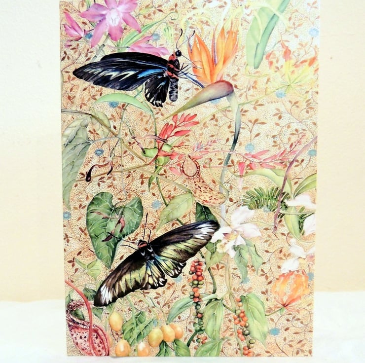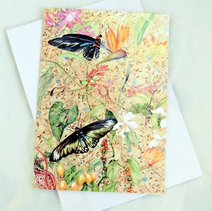 Rectangle A6 greeting card with an image taken from my own original watercolour of the Raj Brookes butterfly flitting amongst the flora of Sarawak