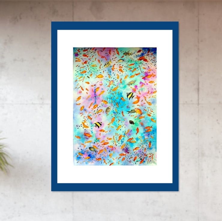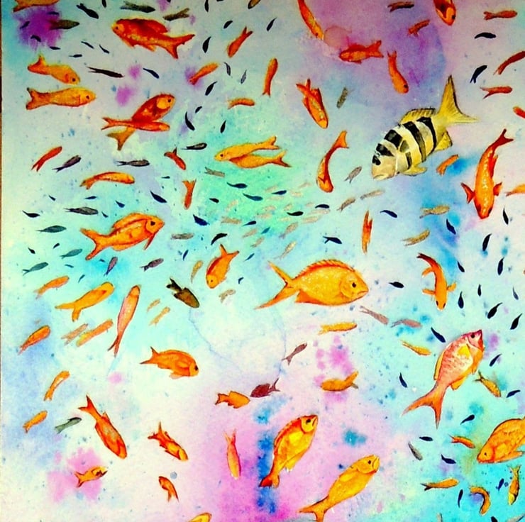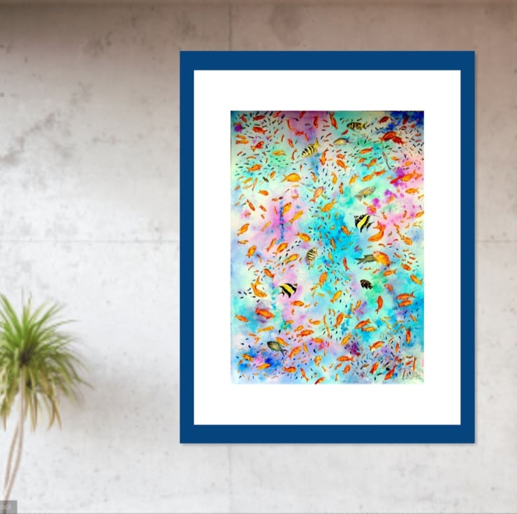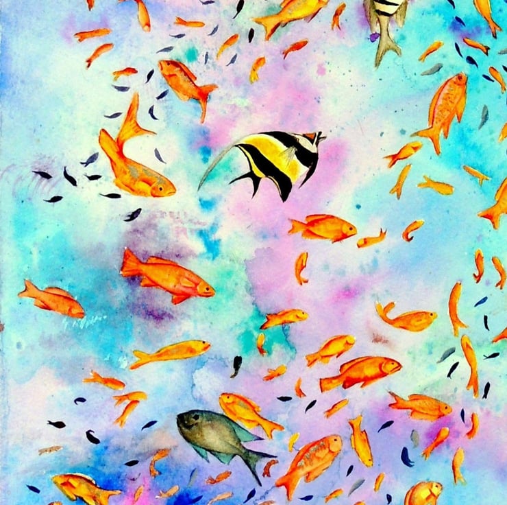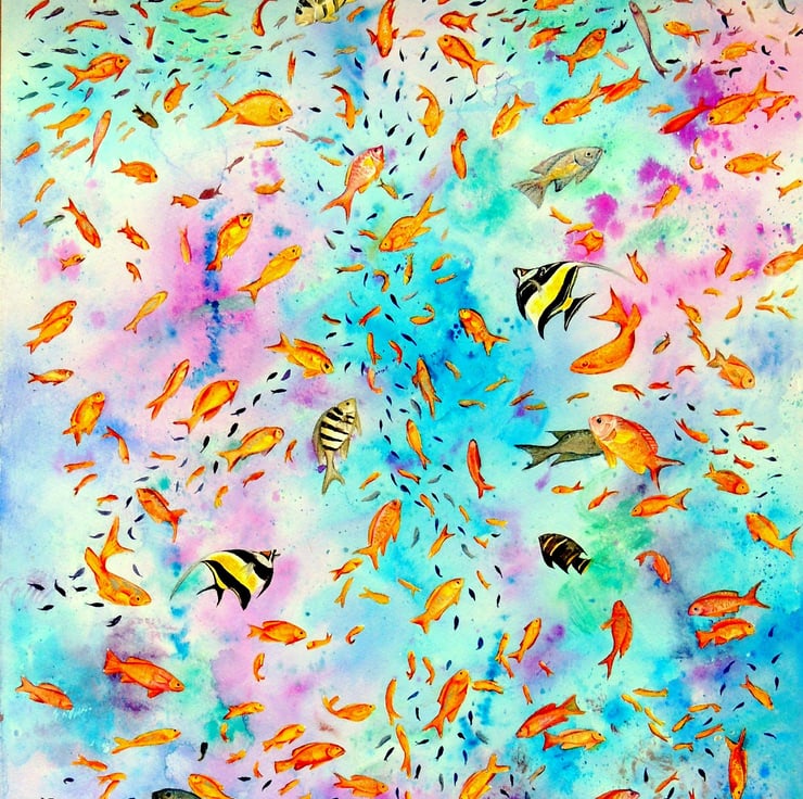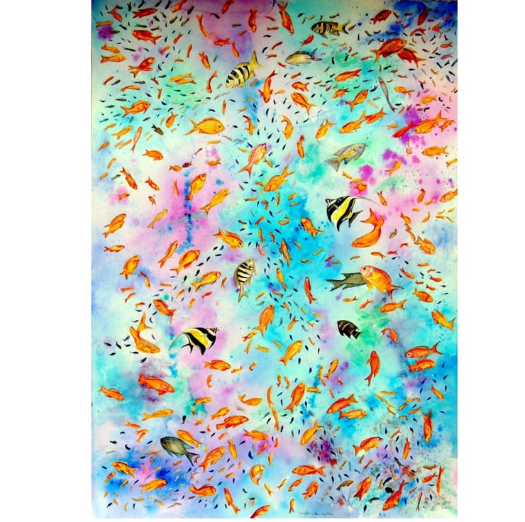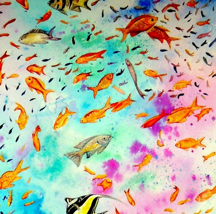 This is a large fish painting of a tropical underwater scene in Seychelles where the reefs are teeming with beautiful creatures of the sea.