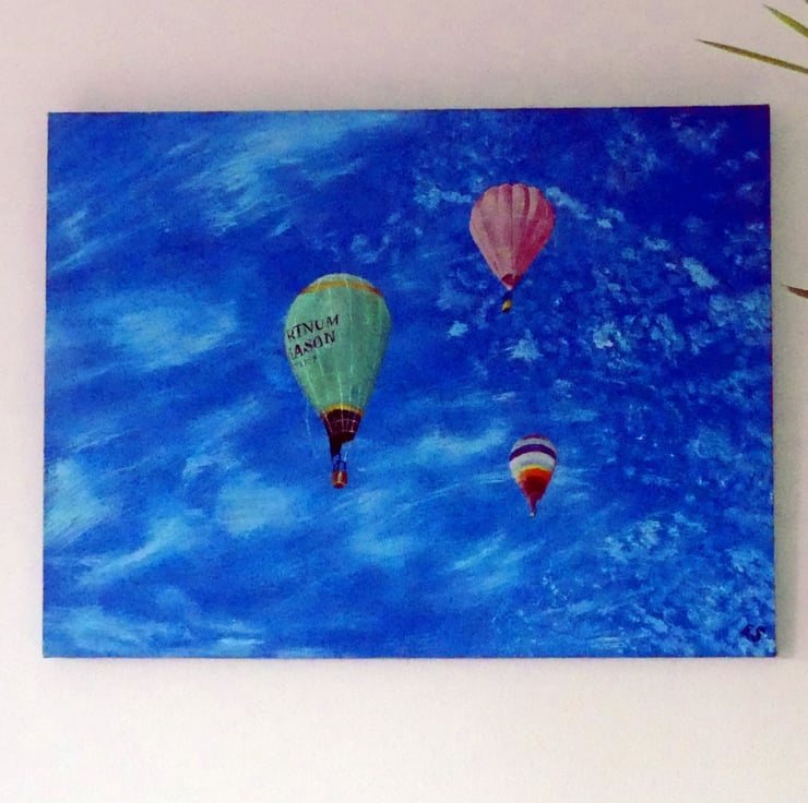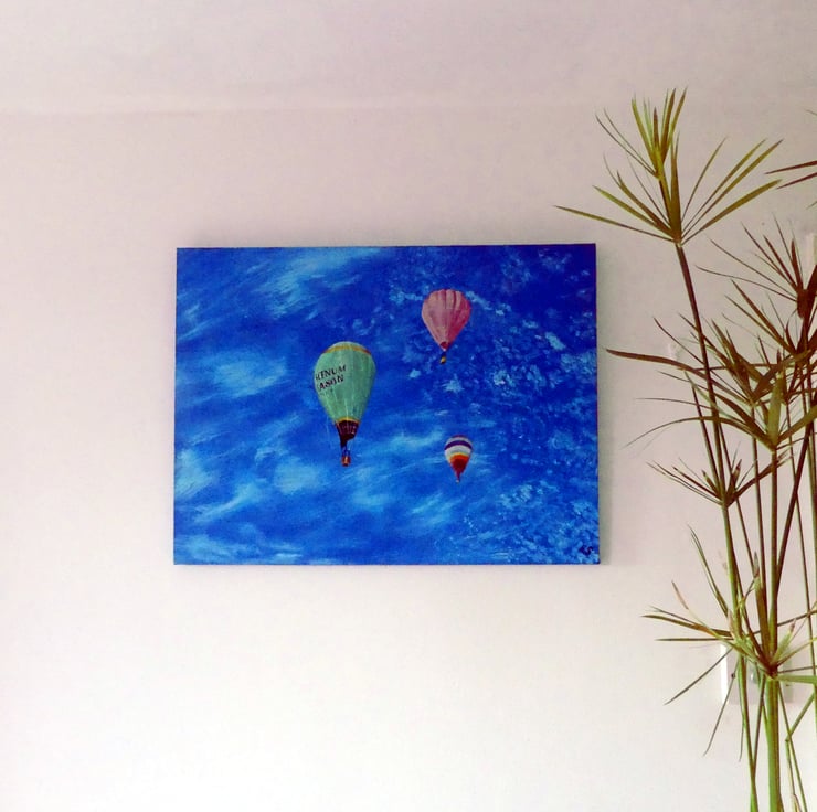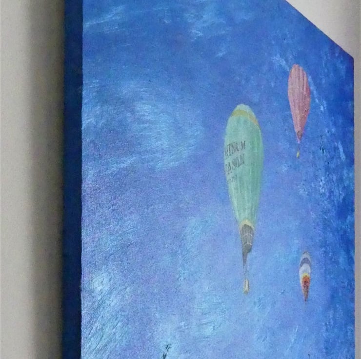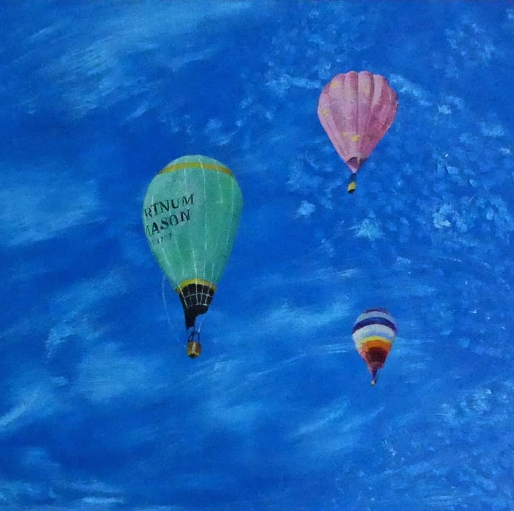 This colourful summer sky original oil painting is inspired by photos I took in the summer of 2016. Pretty hot air balloons, including one sporting the Fortnum & Mason logo, floated over my home village.