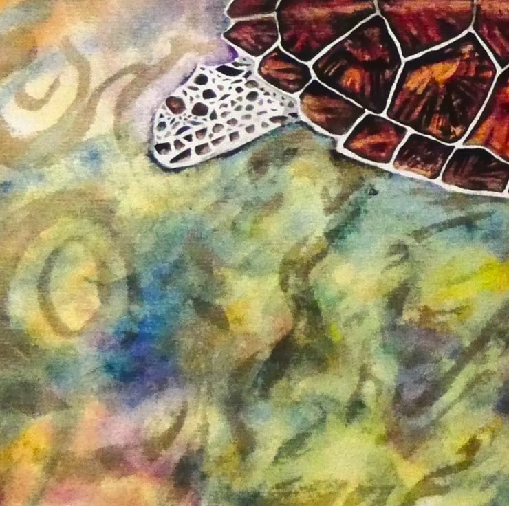 A limited edition print of 75 from my original colourful and detailed watercolour. This young hawksbill turtle is swimming in shallow waters in the lagoon of Aldabra, Seychelles. A mystical creature hunted close to extinction and now protected by anti-hunting laws in many countries.