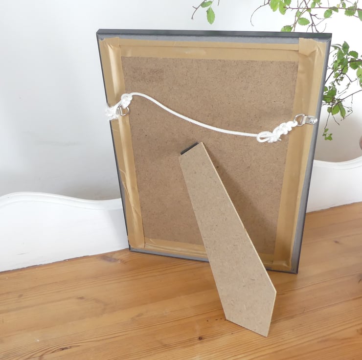 The painting is 4.75 x 6.75 inches, and the total size with white mount and black frame is 9.50 x 13 inches. The painting can stand freely or be hung on the wall