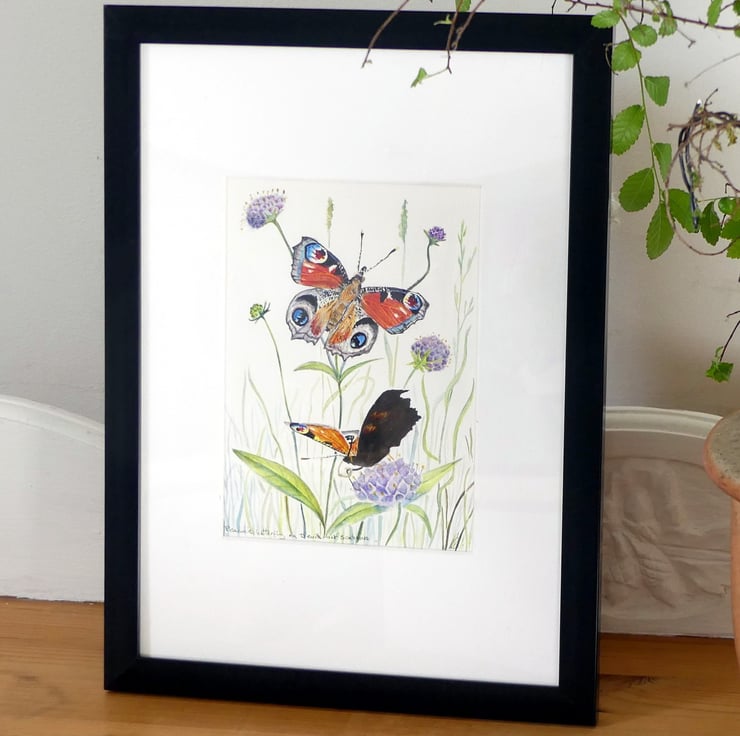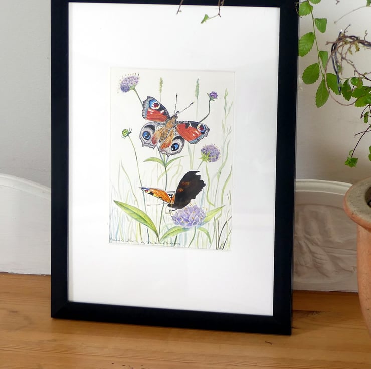 A small botanical fine artwork of peacock butterflies on wildflowers.