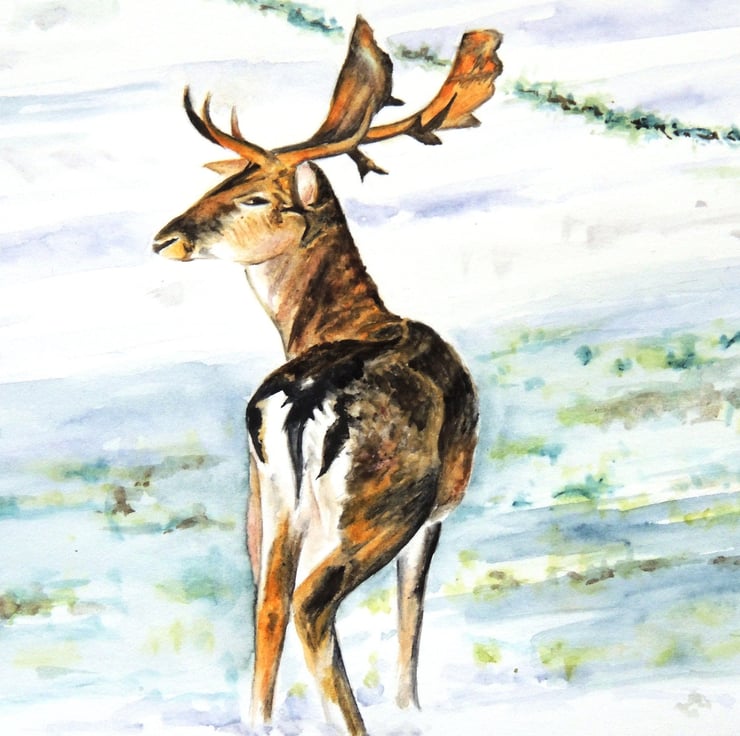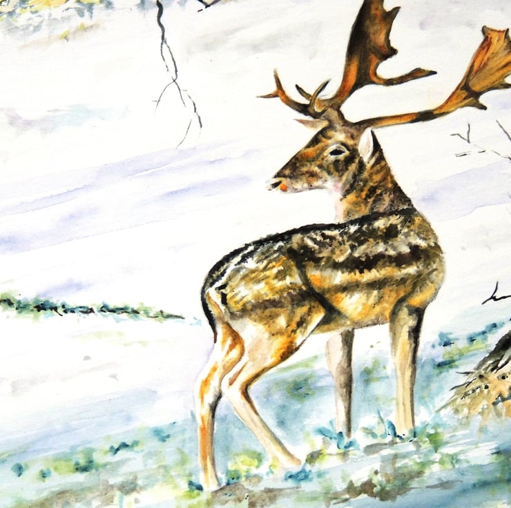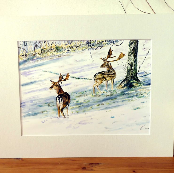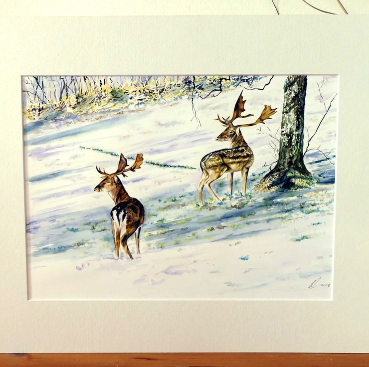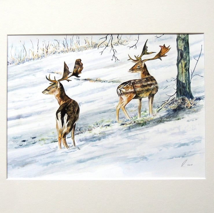 Snowy Woodland with Fallow Deer – Original Watercolour