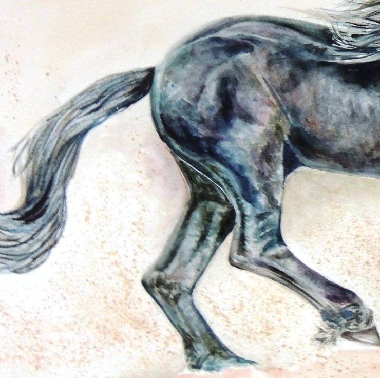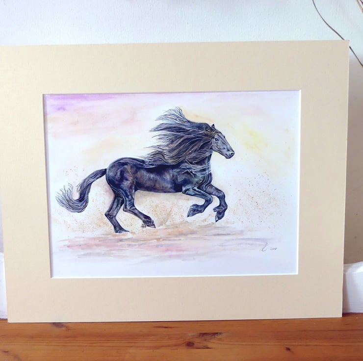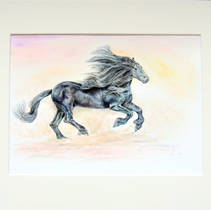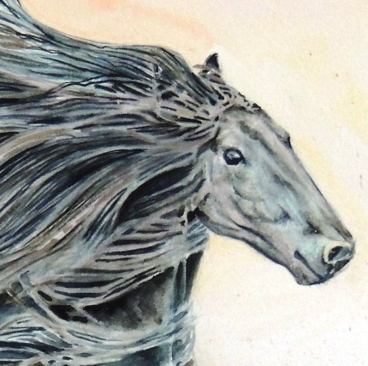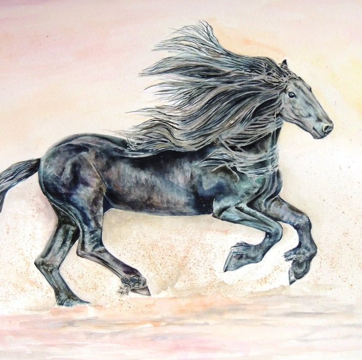 This is a fine art watercolour and ink of a beautiful black horse.