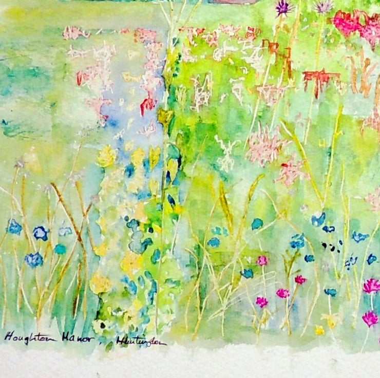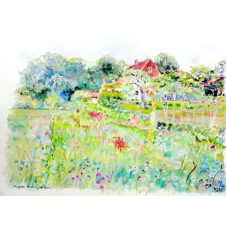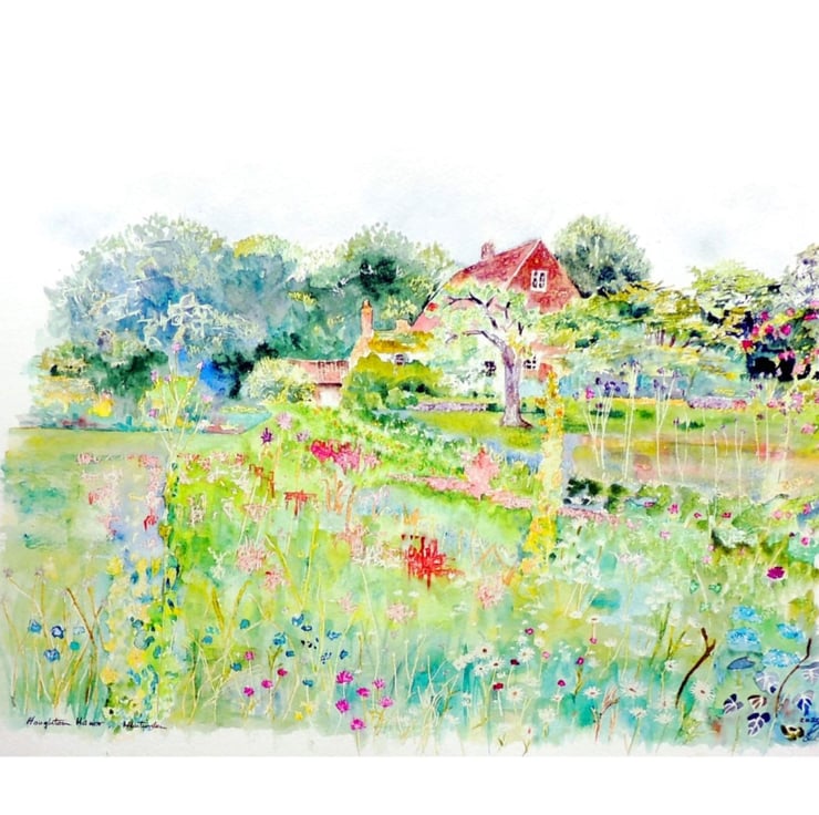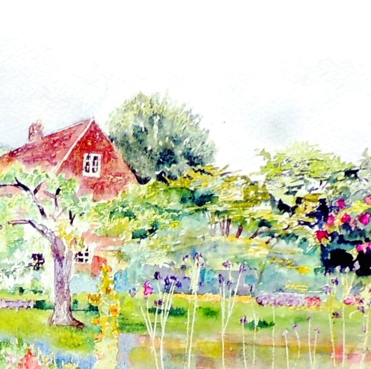 An impressionist watercolour painting capturing the timeless charm of a historic country house nestled within a lush, romantic garden. This piece is inspired by the enchanting gardens of an ancient house in Hemingford Grey, near St Ives, Huntingdon—grounds that have been lovingly tended for many years.