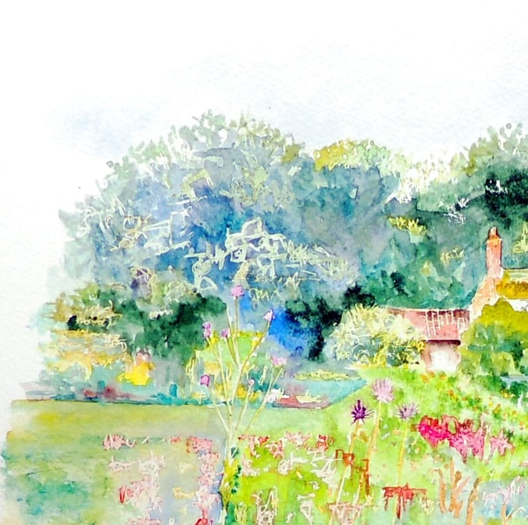 I aimed to convey a sense of untamed beauty, allowing the exuberant forms and vivid colours of the garden to dance across the composition, gently pushing the house and treeline into the distance. The result is a light, buoyant atmosphere full of life and movement.