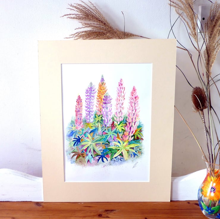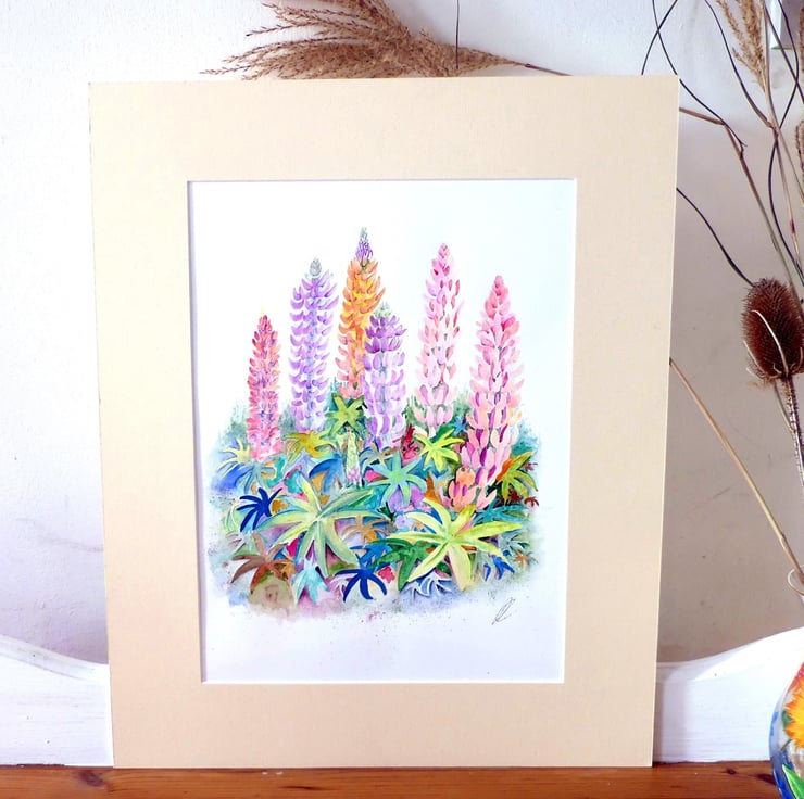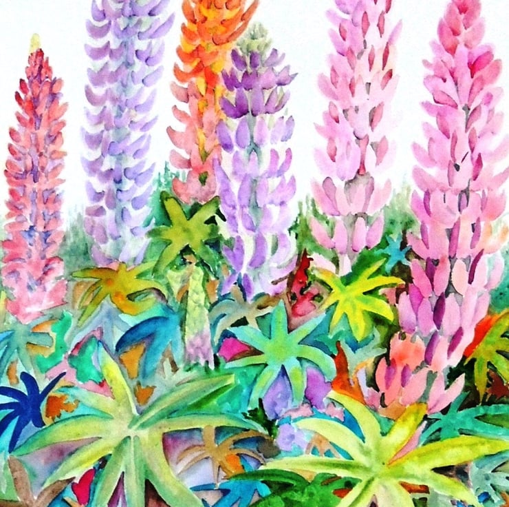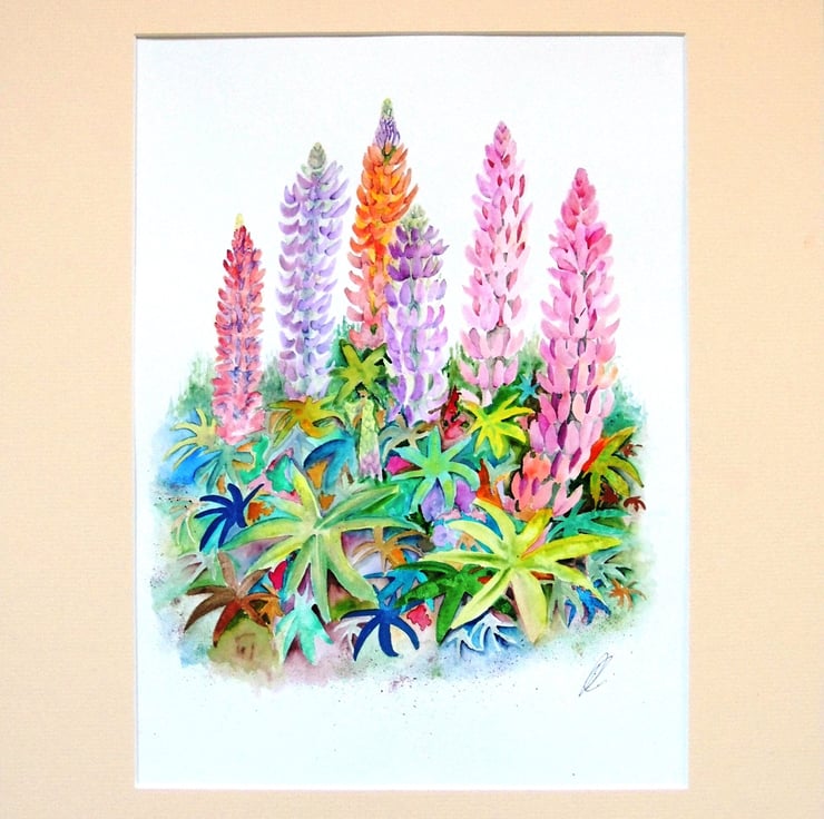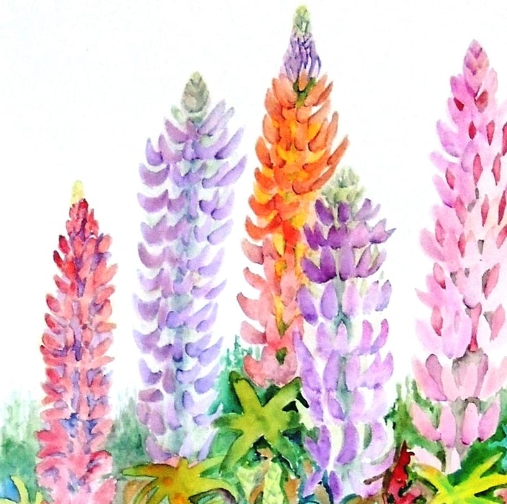 This is a pretty garden flower modern botanical watercolour original painting of colourful lupin flowers in soft yet translucent shades