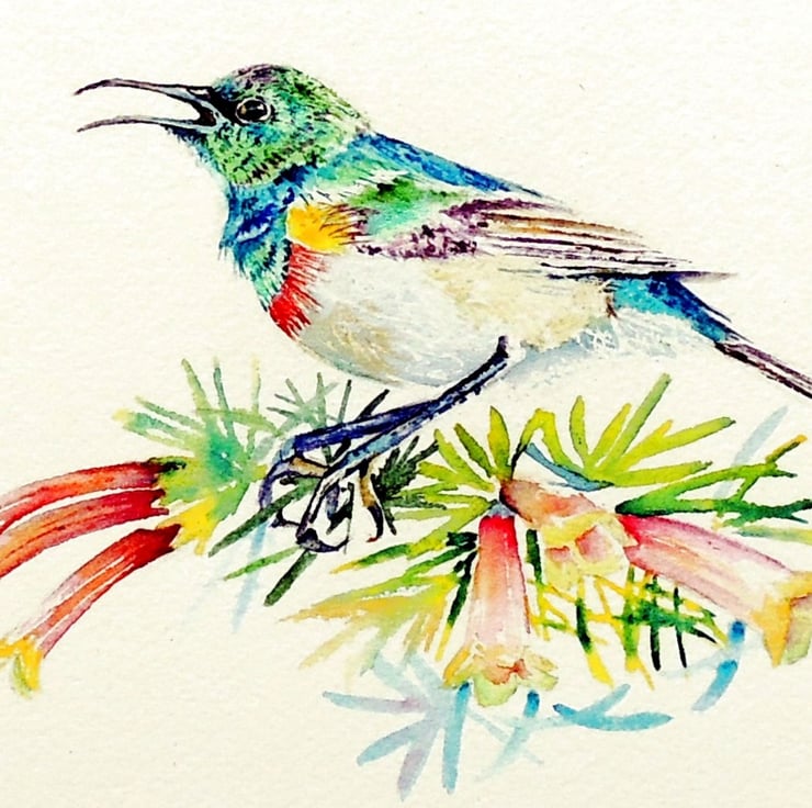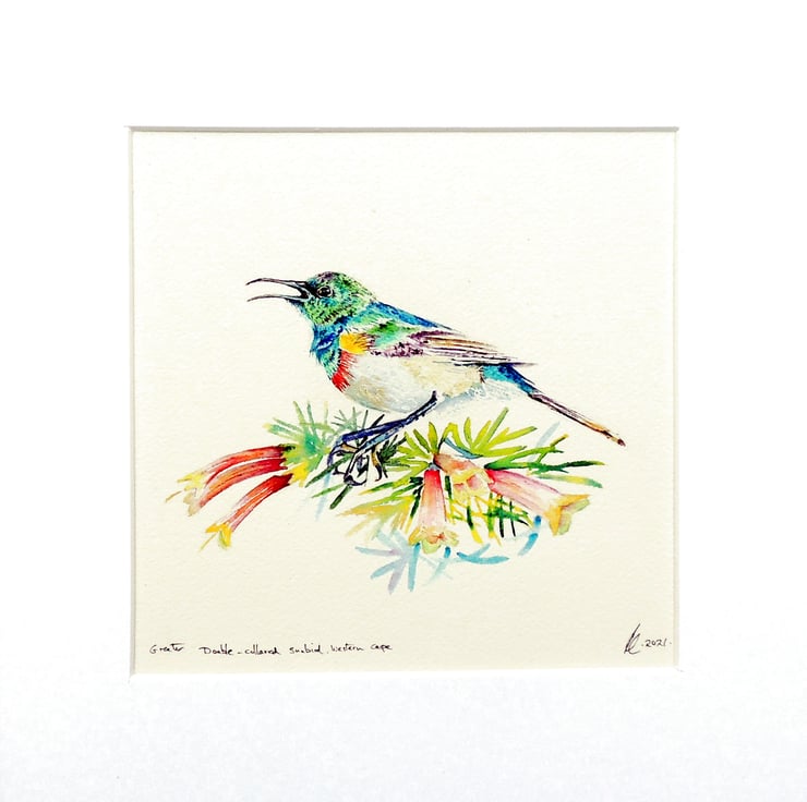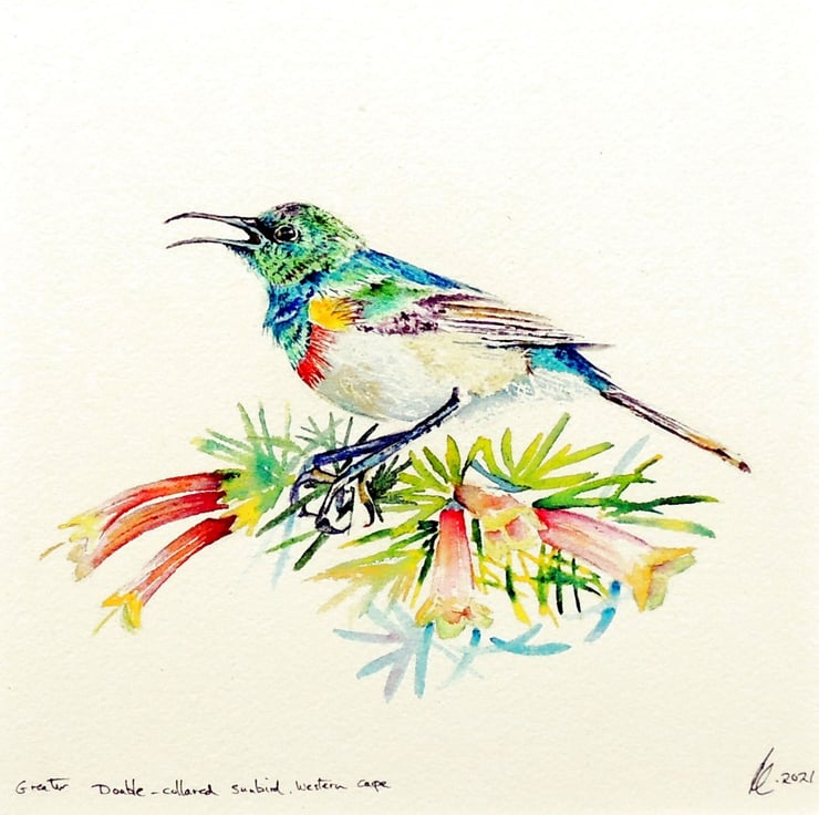 This pretty little double-collared sunbird was darting amongst the branches of a George One-color Heath bush in the Kirstenbosch botanical gardens. All sunbirds have such metallic bright colours and make for irresistible inspiration, they love tubular flowers from which they sip nectar.