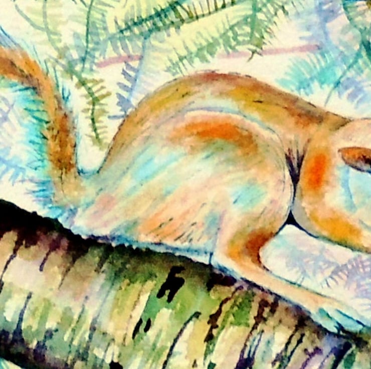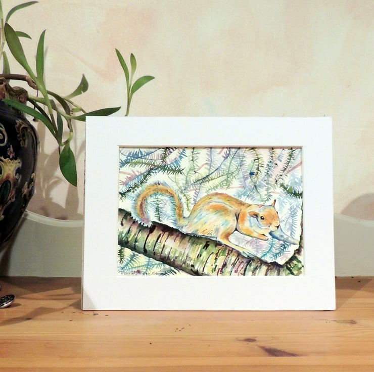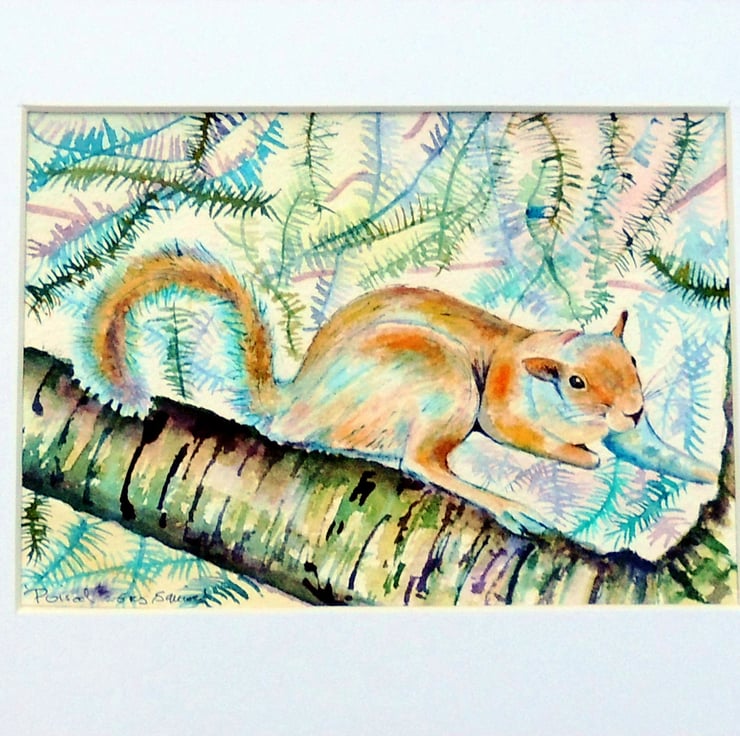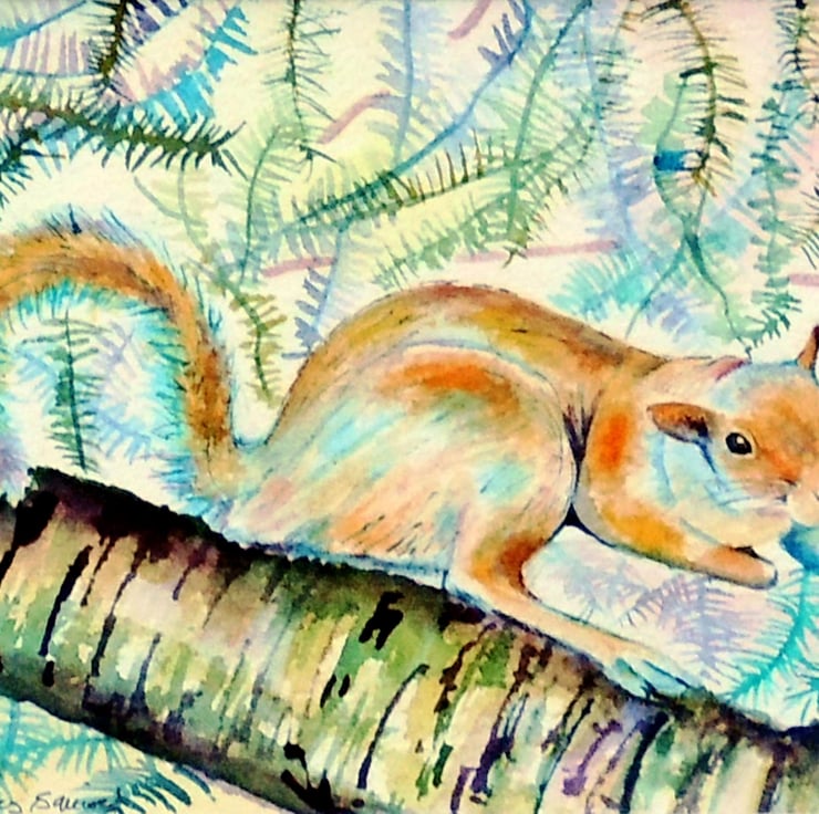 This is a small lighthearted watercolour of a cheeky squirrel I photoed on a day out in a park in Bury a few summers ago. Grey squirrels' coat colours vary considerably, and this squirrel is quite a lovely dusky red.