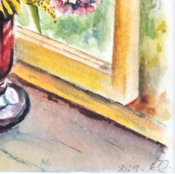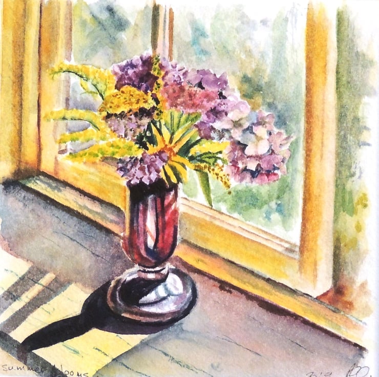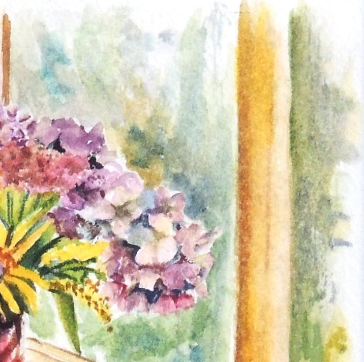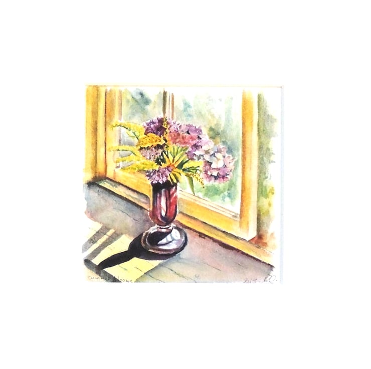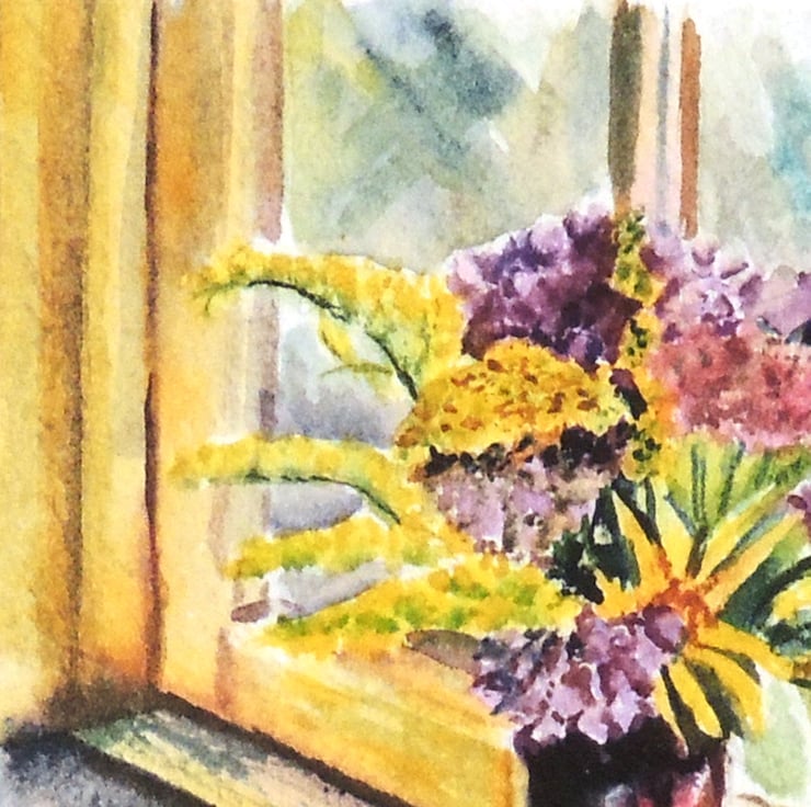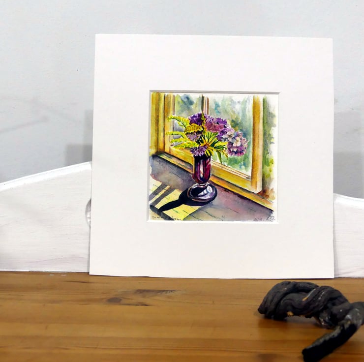 A small square still life watercolour painting of flowers in a cottage window. IThe sunlight streams through the glass making the strong hues of the hydrangeas and golden rod more intense. Professional watercolour paints on Fabriano watercolor paper. The painting is 4.75 x 4.75 inches and the white mount is 9 x 9 inches