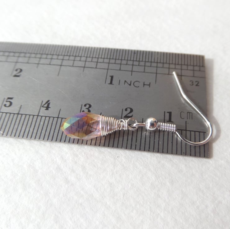 On silver plated fish hooks, these are short drop, wire wrapped briolette crystals earrings.