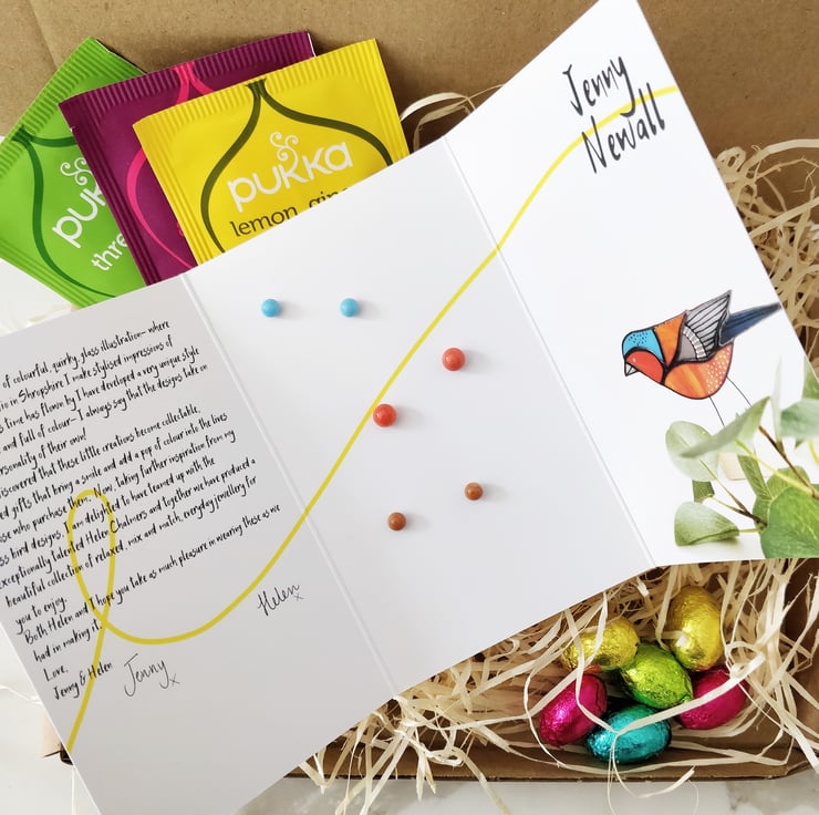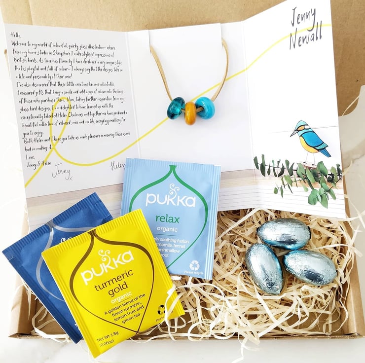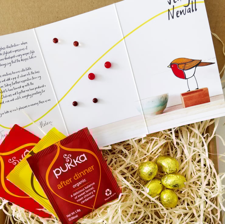 Included within each box is a piece of jewellery from my collections ( flexible necklace/ bracelet or earrings) worth between £17 and £20. I've also included some chocolates and a selection of herbal teas. I'm a great believer that there isn't much that can't be fixed with tea, a bit of choccie and sparkles!