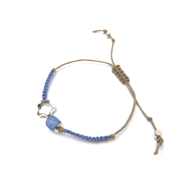 in beige cotton cord with blue macramé over and a blue glass bead to accent the focal.