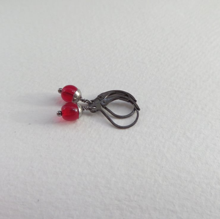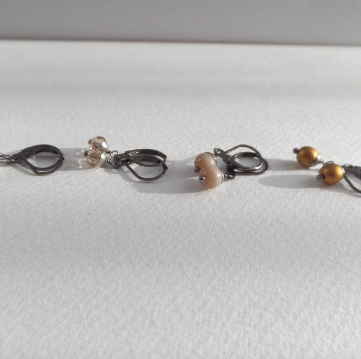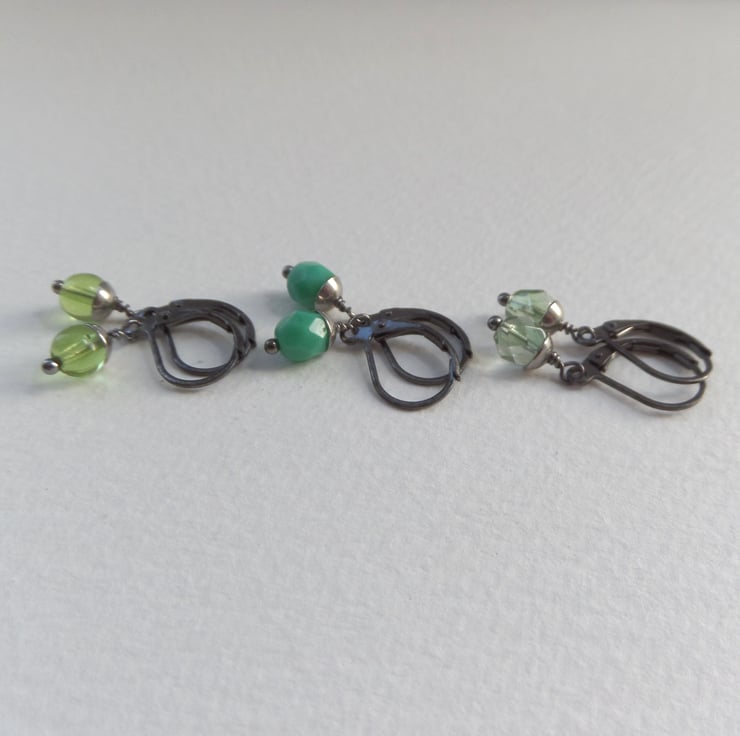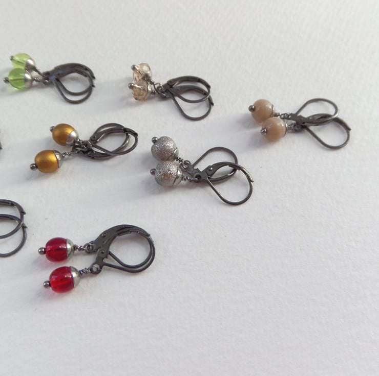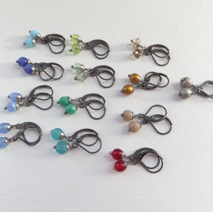 From my super popular range of dainty modern earrings. A nearly black gunmetal secure fitting, these are a range of glass beaded, steel capped dangles.