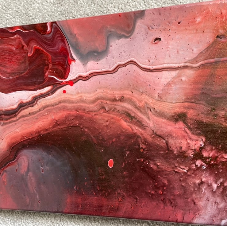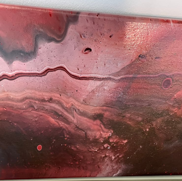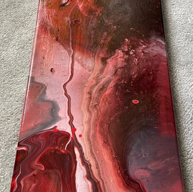 20x8” cotton canvas with a fluid art design depicting an intergalactic theme. The hand mixed colours are perfect for the theme and added silicone oil creates amazing cell effects adding to the design. Canvas is coated in gloss varnish for protection and extra shine.