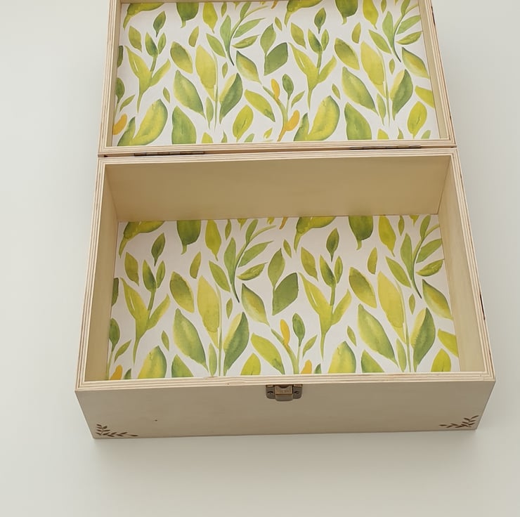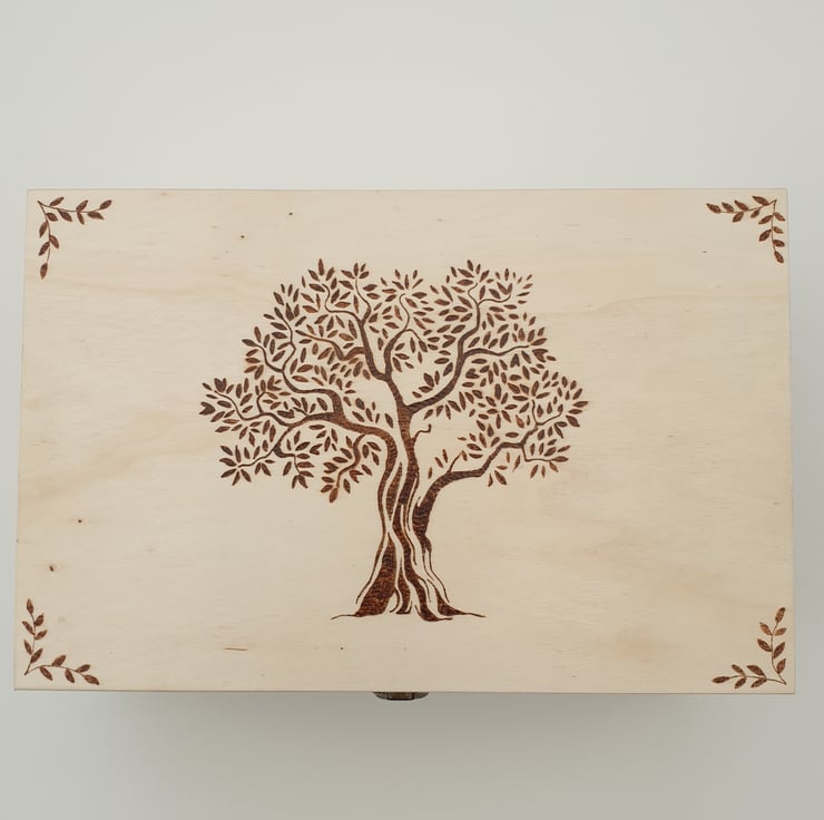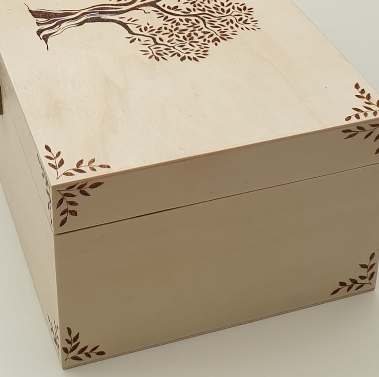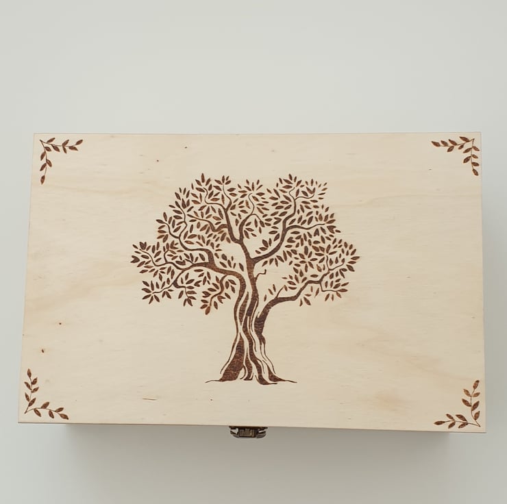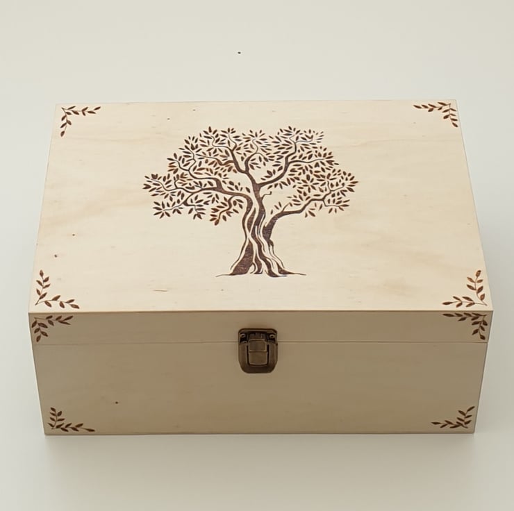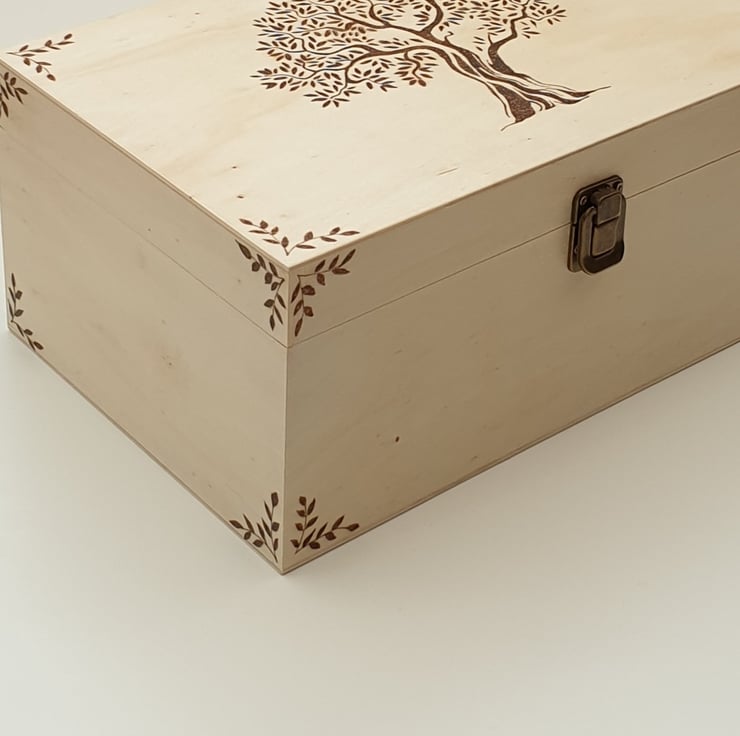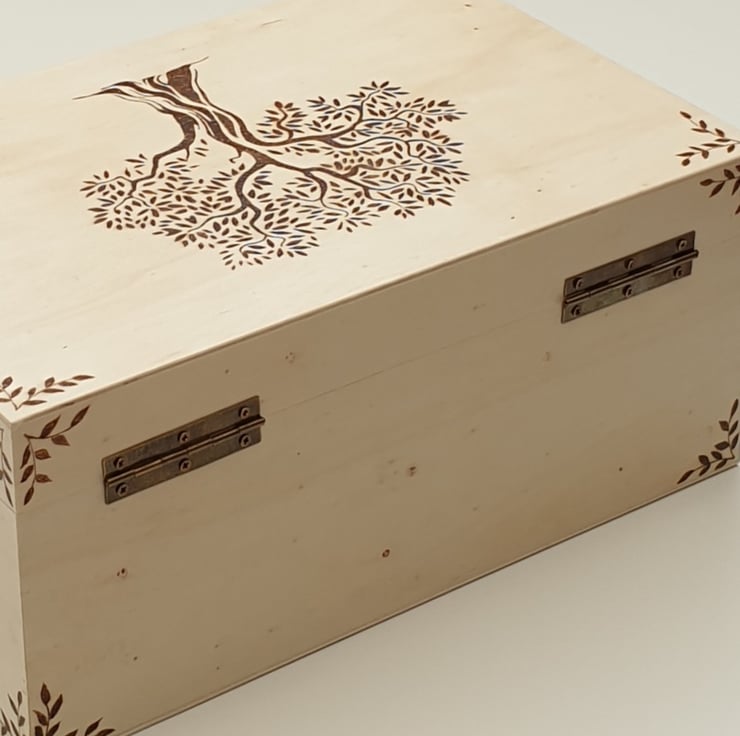 Lovely large wooden storage box with secure metal clasp which has been decorated using the art of pyrography with a majestic old tree design. The box has then had several coats of varnish for protection. The inside of the box has been lined with decorative green leaf card for added character.