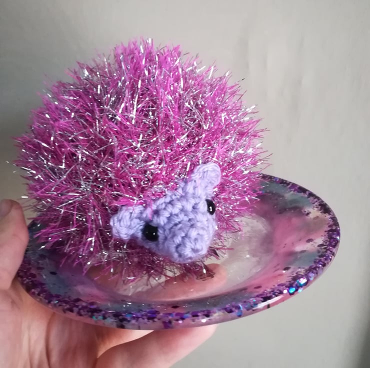 This puff is made from a sparkling pink and silver yarn. The puff has a lovely lavender coloured face.