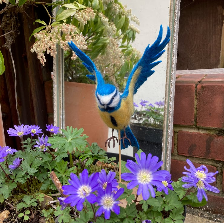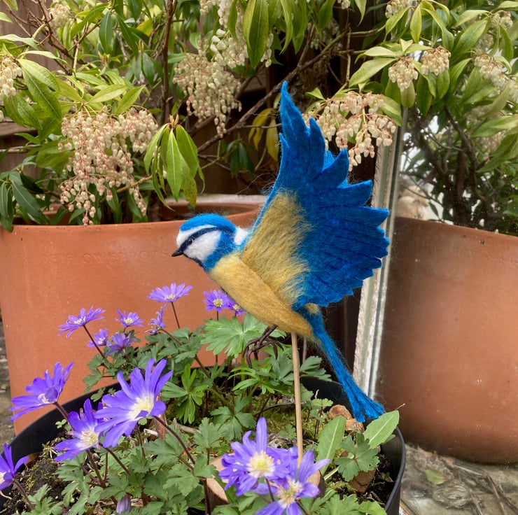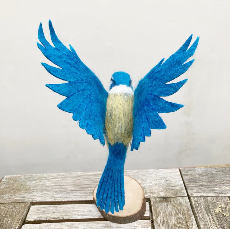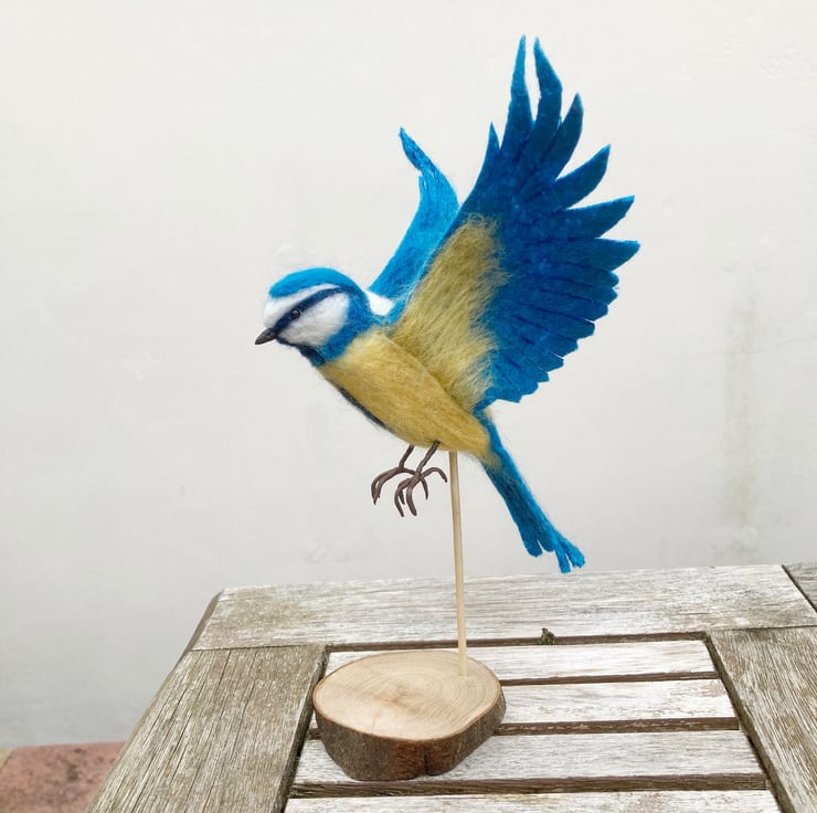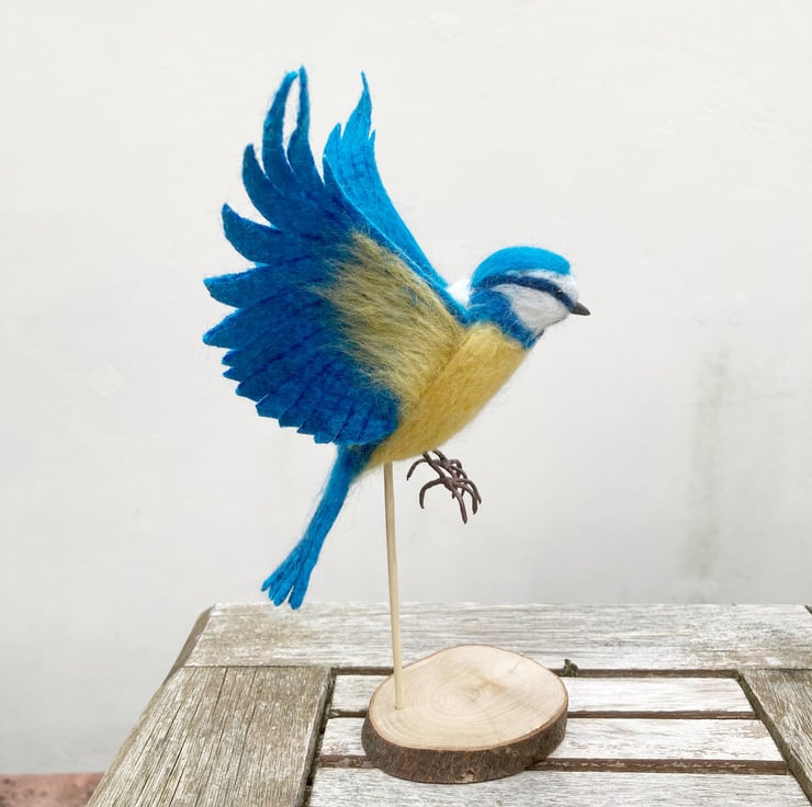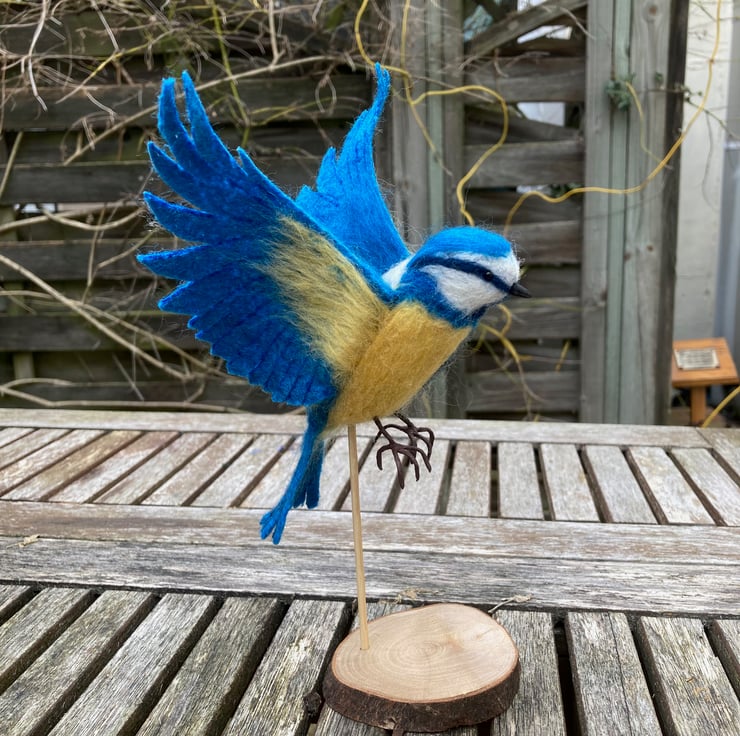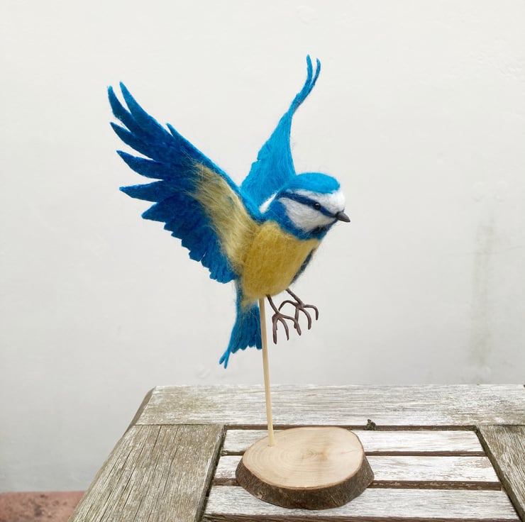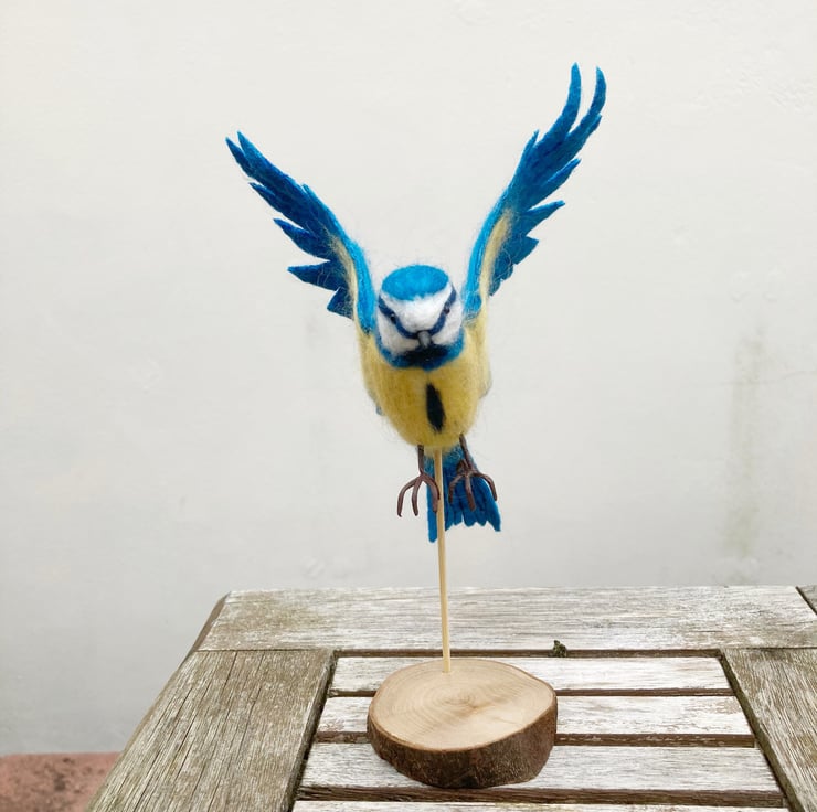 This gorgeous blue tit model has been sculpted using woollen fibres and a barbed felting needle. A core of white wool sculpted into shape has been covered in coloured woollen fibres to create the markings. He has been created "in flight" with his wings and tail formed from stiffened wet felted fibres. The beak is made from silk clay, the eyes are beaded and the feet are wire wrapped with tape. The blue tit has been mounted using a wooden dowel to a rustic wooden slice. The blue tit is roughly life-sized measuring approximately 16cm from head to tail. The whole ornament stands approximately 24cm tall.