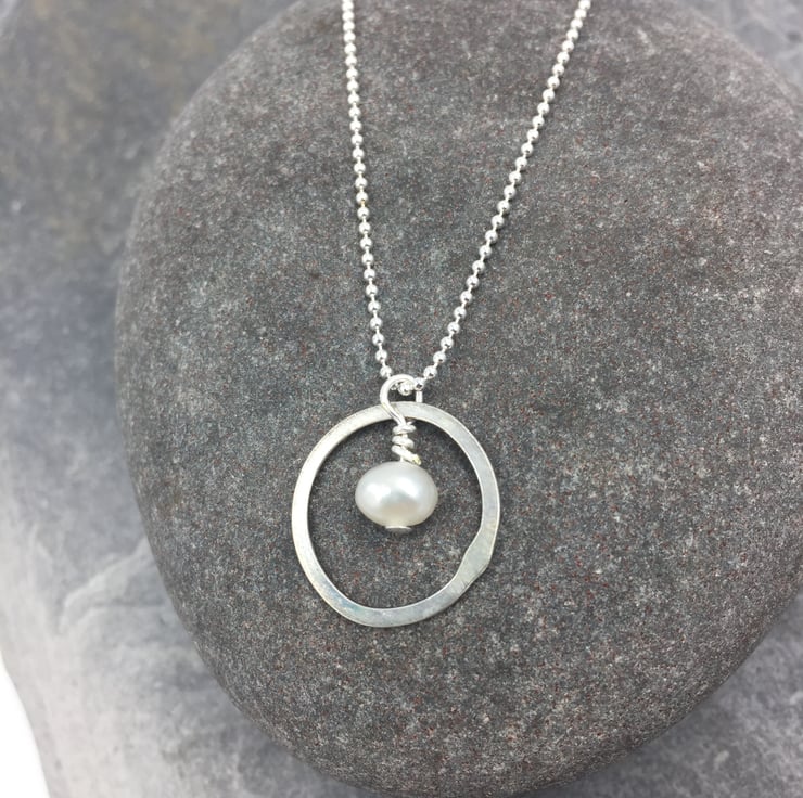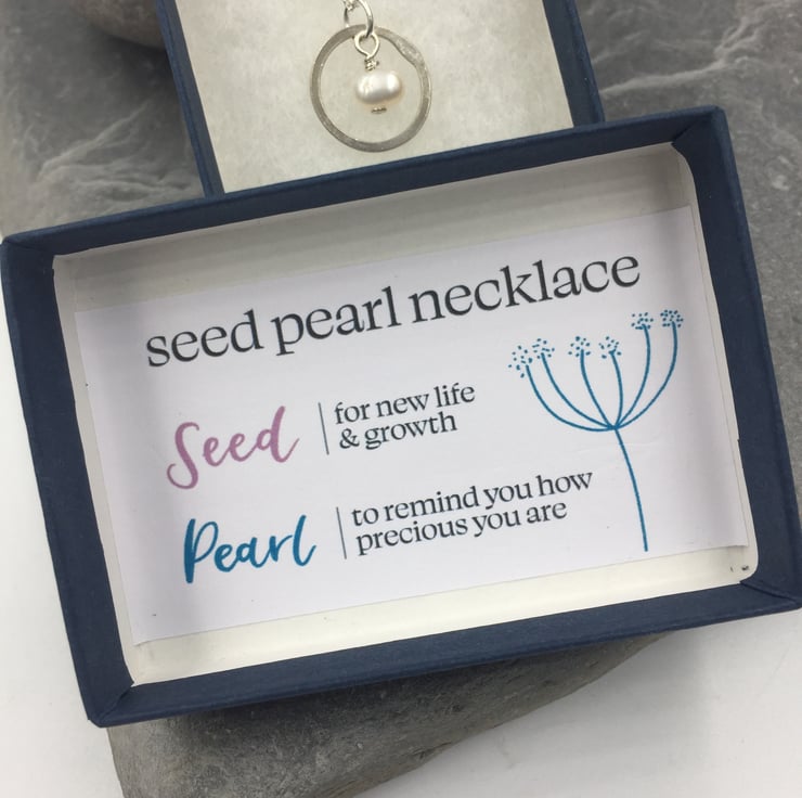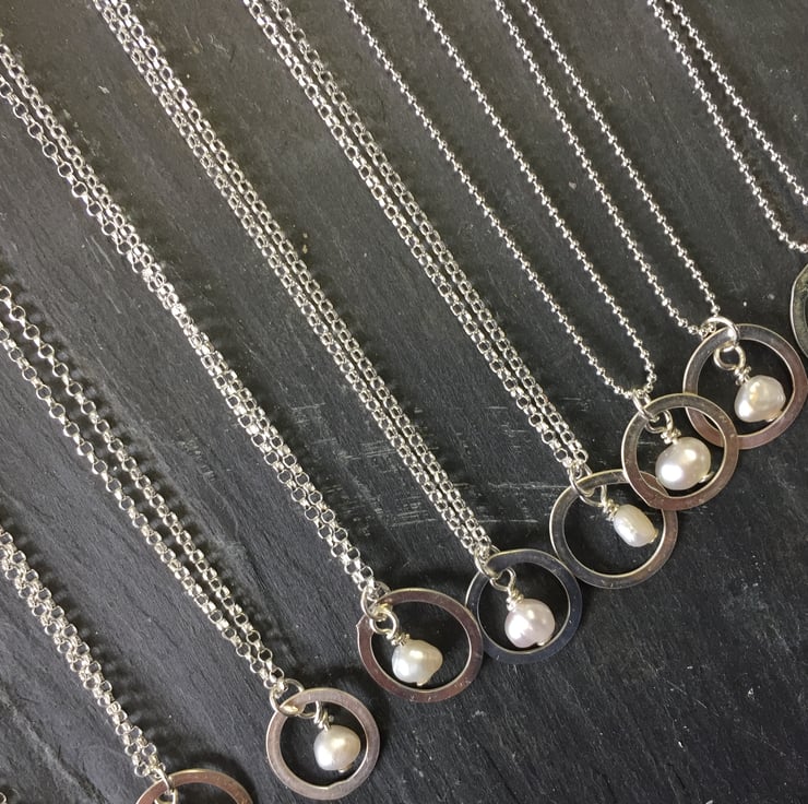 This little beauty was designed and made to support a charity working with vulnerable women in Bristol. A tiny white seed pearl is surrounded by a handmade sterling silver ring. It hangs from a 16” sterling silver chain.